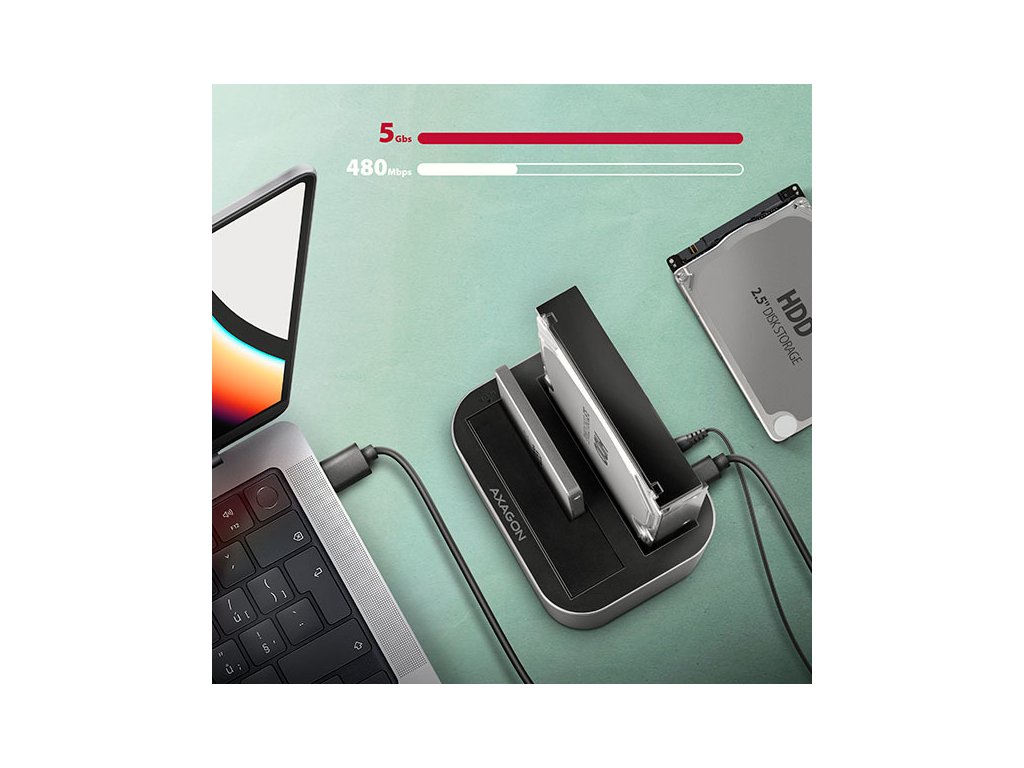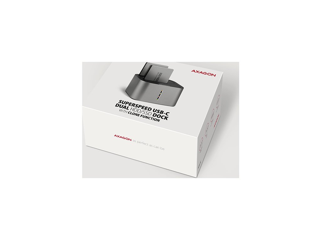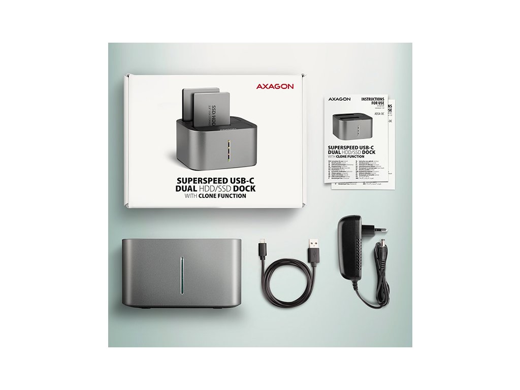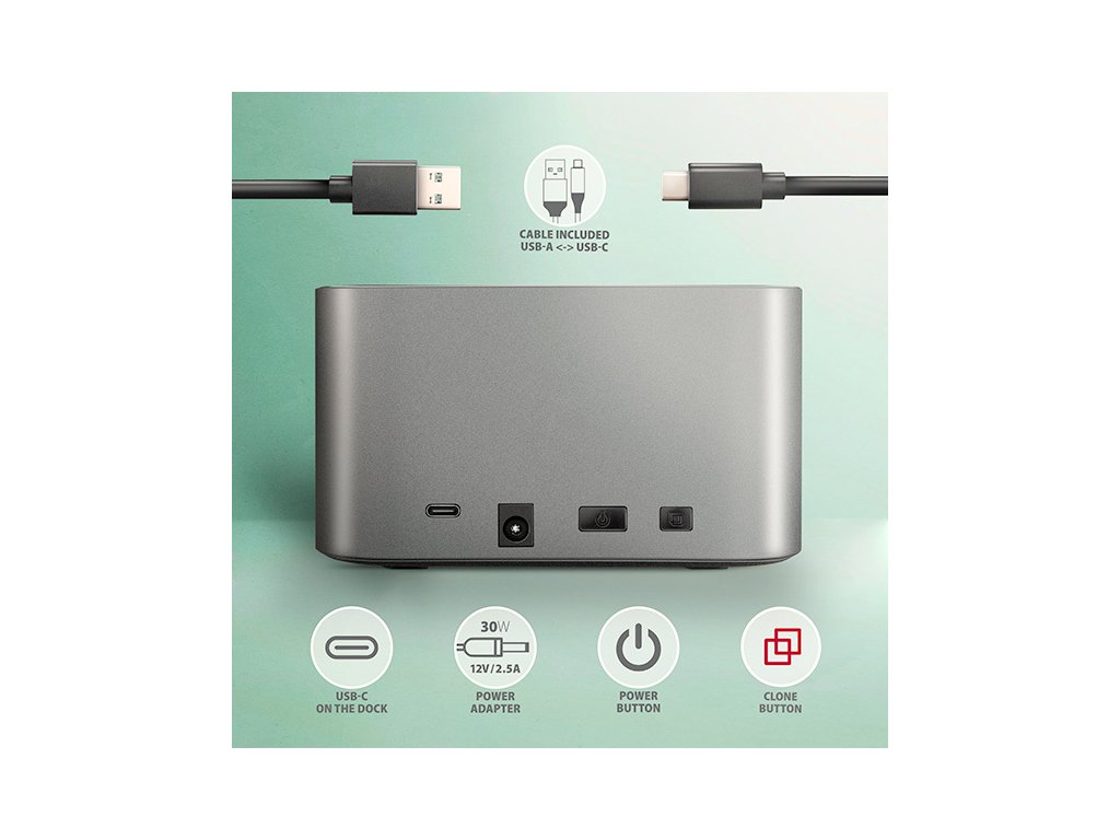 Dokovacia / klonovacia stanica SuperSpeed USB-C 5 Gb/s AXAGON ADSA-DC DUAL CLONE pripojí k počítaču rýchlo a jednoducho až dva 2,5" alebo 3,5" disky. Pripojenie k počítaču umožňuje moderný obojstranný USB-C konektor na doku spolu s dodávaným USB-C <-> USB-A káblom s dĺžkou 80 cm.