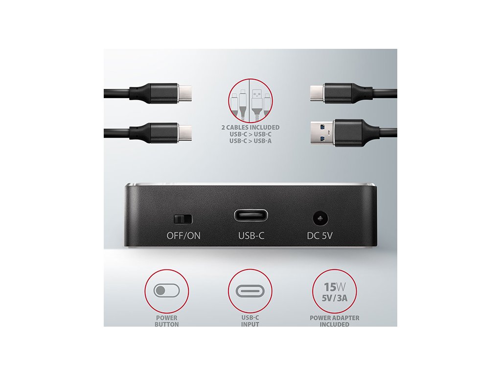 Dokovacia stanica AXAGON ADSA-M2C DUAL NVMe CLONE MASTER DOCKSuperSpeed USB-C 10 Gb/s ľahko a rýchlo pripojí až dve zariadenia NVMe (PCI-Express) M.2 disky SSD. Obojstranný konektor USB-Cposkytuje pohodlné pripojenie. v balení nájdete dva káble na pripojenie dokovacej stanice - klasický kábel USB-C -> USB-A a kábel USB-C -> USB-C.