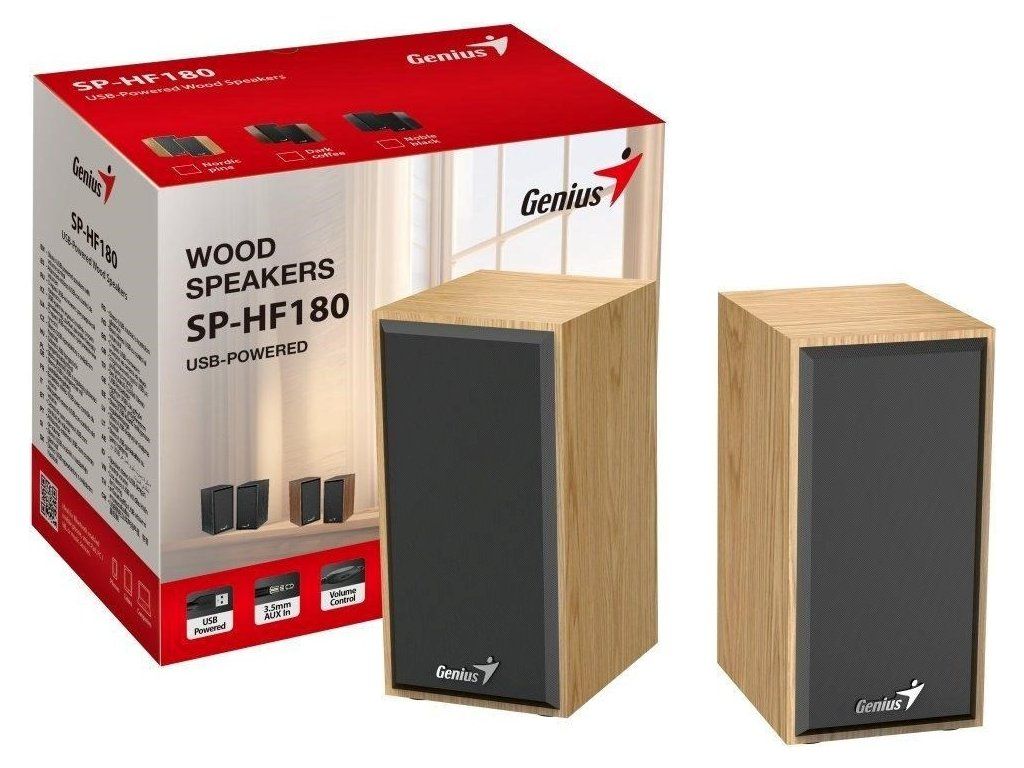 Kompaktné reproduktory Genius SP-HF180, ktoré dosahujú celkový výkon a sú tak vhodné pre každodenné ozvučenie bežných multimédií na vašom PC alebo notebooku. Vzhľadom na prítomnosť 3,5mm konektora sú reproduktory kompatibilné aj s TV či smartphonem, na napájanie slúži USB port. Drevená konštrukcia prenáša stolovým reproduktorom elegantný vzhľad a zároveň sa podieľa na prirodzenom podaní zvuku. Reproduktory Genius SP-HF180 sa vyznačujú nízkou váhou a malými rozmermi, takže ich ľahko umiestnite na akékoľvek miesto na stole.