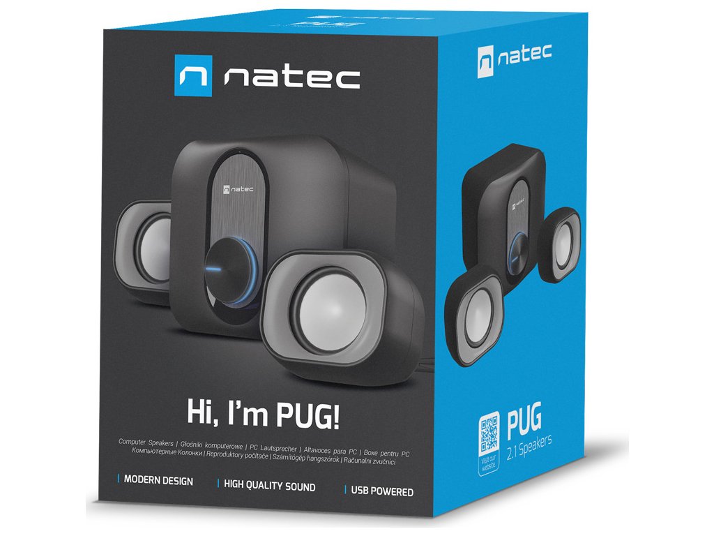 Kompaktní reproduktory s plným (včetně basů) zvukem - tak lze ve zkratce popsat Natec PUG. Tato malá sestava s celkovým výkonem 11 W dokáže překvapit, poradí si jak se složitými hudebními žánry, filmy, tak i s přehráváním multimediálních materiálů potřebných pro práci a studium. Dostatek basů má na svědomí 5W woofer, díky němuž je Natec PUG mimořádně všestranný.