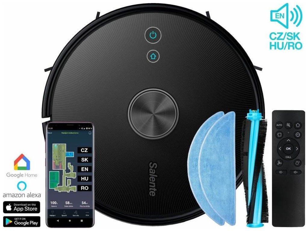 Aplikácia Salente umožňuje ovládať vysávač mobilným telefónom alebo tabletom na diaľku. Informuje vás o aktuálnom stave vysávača, môžete spustiť rôzne režimy upratovania alebo nastaviť úroveň vysávania alebo mopovania. Aplikácia je v slovenskom jazyku a je určená pre operačné systémy Android a iOS. Ak nie ste fanúšikom mobilných aplikácií, môžete vysávač ovládať aj pomocou priloženého diaľkového ovládača alebo tlačidiel na vysávači.