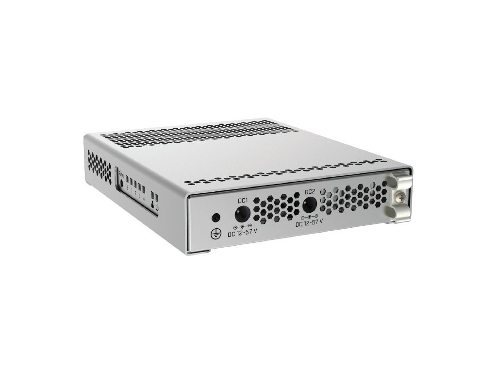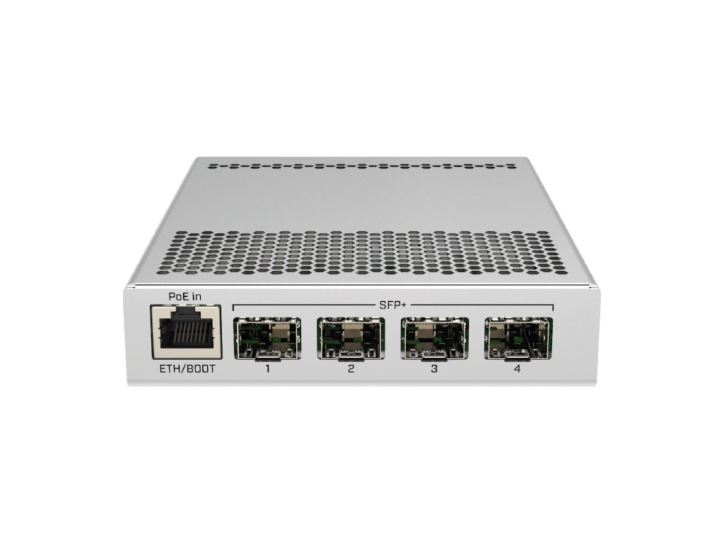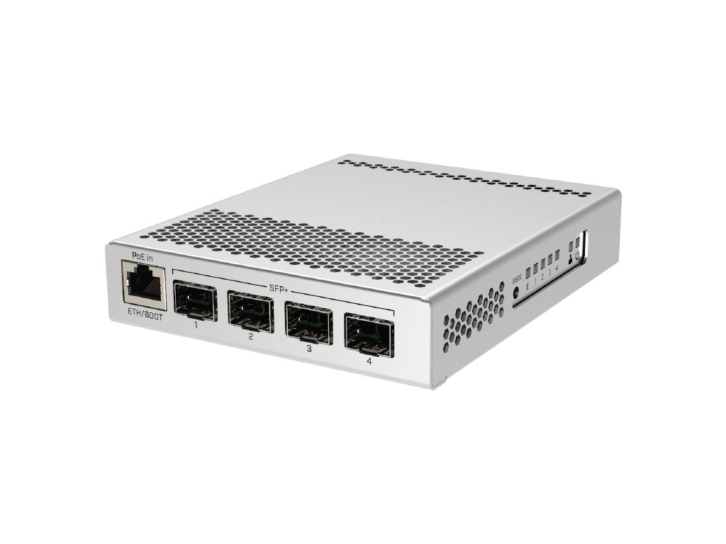CRS305-1G-4S+IN je kompaktný, ale výkonný prepínač so štyrmi portami SFP+ s rýchlosťou 10 Gb/s/port. Okrem optických portov má zariadenie aj jeden gigabitový ethernetový port s podporou POE IN na jednoduchý prístup k zariadeniu, konfiguráciu zariadenia alebo konverziu na metalickú linku. Na redundantné napájanie sú k dispozícii dva konektory DC. Vypínač je veľmi elegantný, kompaktný a jeho kovové puzdro bez ventilátora zaručuje tichú prevádzku.