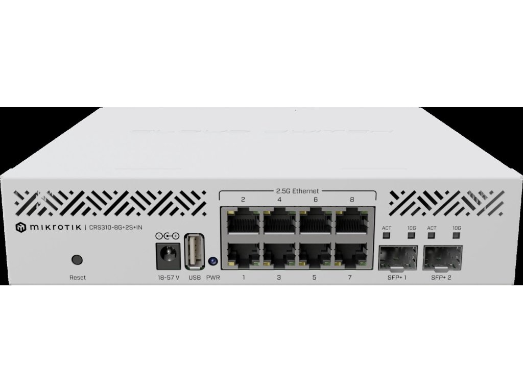 Model CRS310-8G+2S+IN vám nabízí řešení integrující kombinaci osmi 2,5 Gbps ethernet portů a dvou 10Bgps portů SFP+ v kompaktním a výkonném prvku.