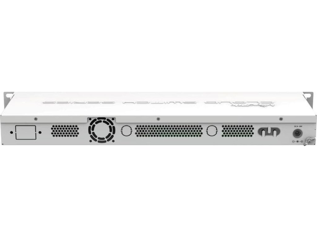 Co se konektorové výbavy týče, switch disponuje 24 GLAN porty (10/100/1000) s podporou pasivního PoE na prvním portu, dvojicí SFP/SFP+ portů podporující jak 1.25Gbps tak 10G moduly, RJ45 sériový port a napájecím konektorem na zadní straně s variabilním napájením 9 až 30V DC.