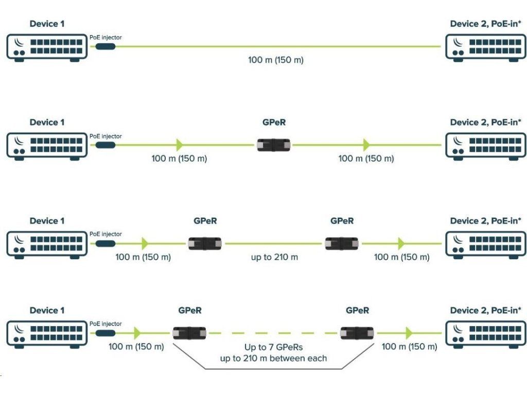 gPeR Gigabitový pasívny ethernetový opakovač umožňuje predĺžiť celkovú dĺžku kábla medzi začiatkom a koncom až na 1500 m! (pri použití 7 GPeR) Vhodné pre výškové budovy, viacbytové budovy s mnohými poschodiami a sekciami, kde by mohli byť veľmi dlhé ethernetové káble.