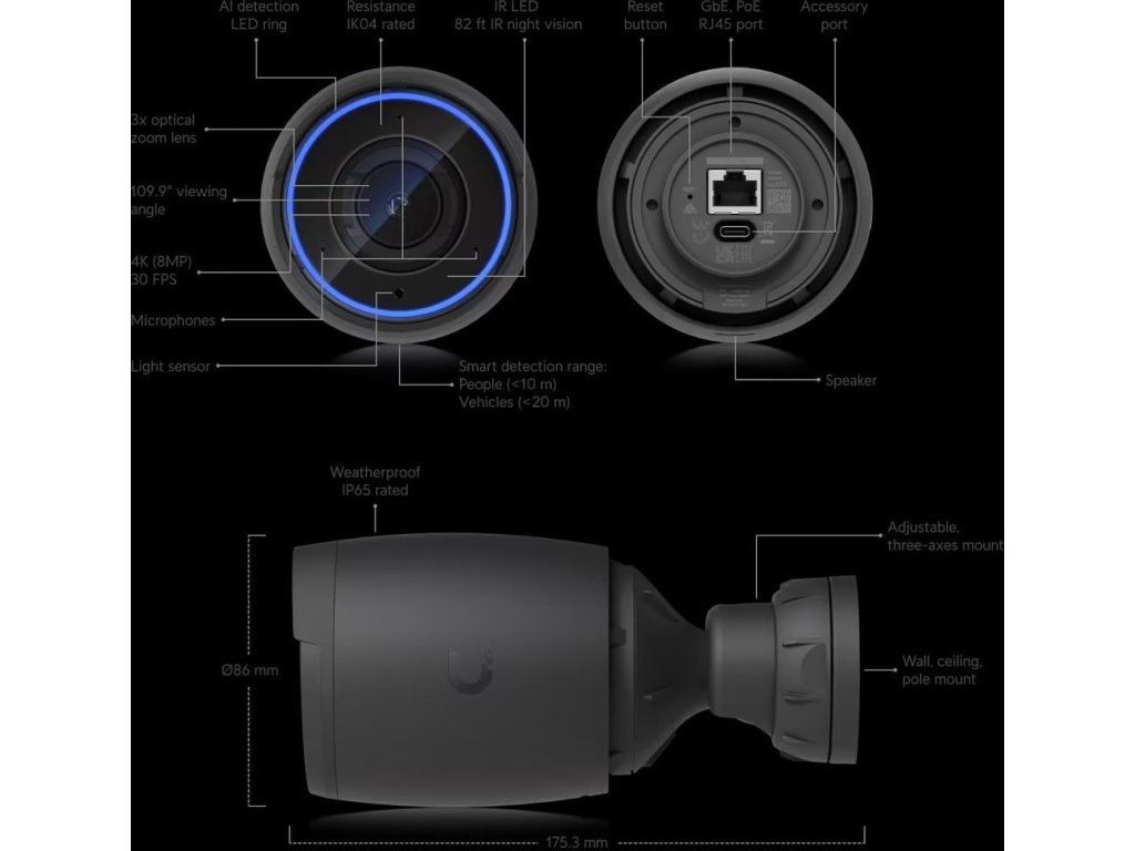 Bullet kamera AI Professional od Ubiquiti Networks je kamera s 8MP rozlišením (3840 x 2160px při 30 fps), opravdu velkým 1/1.8" senzorem, varifokálním objektivem 4.1 až 12.3mm, motorickým 3x optickým zoomem, pozorovacím úhlem 35 až 110°, integrovanými vysokovýkonnými infračervenými LED diodami pro noční vidění, mikrofonem, reproduktorem, stupněm krytí IP65 proti vodě a antivandal ochraně IK04. Kamera ke komunikaci směrem do sítě využívá Gigabitový LAN port s podporou napájení přes 802.3af PoE s maximální spotřebou 11W.