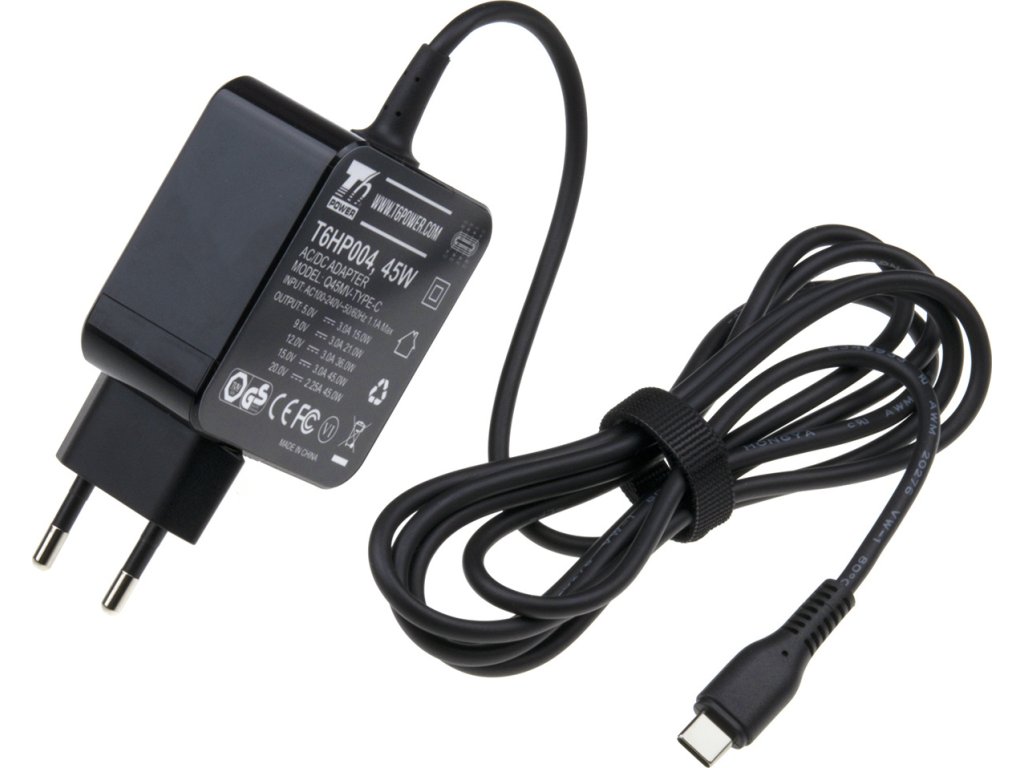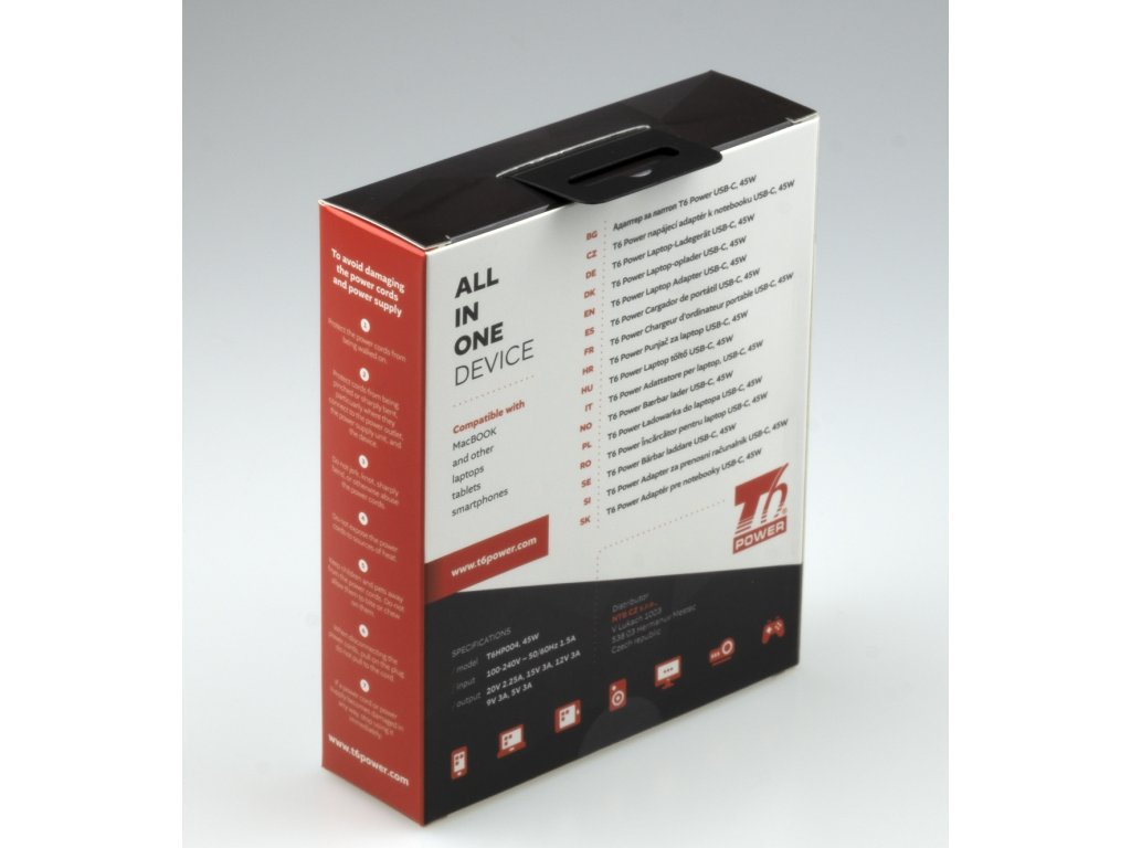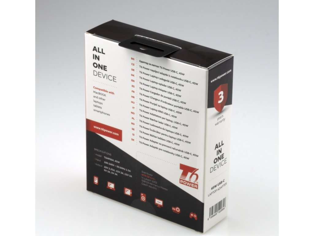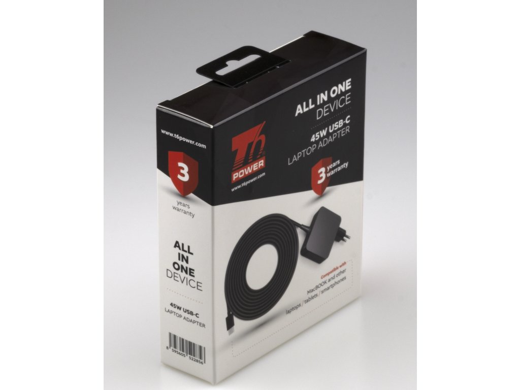 Univerzální adaptér značky T6 Power s výkonem 45 W je ideálním zdrojem energie pro notebooky, ultrabooky, MacBooky, tablety, mobílní telefony, monitory, atd.