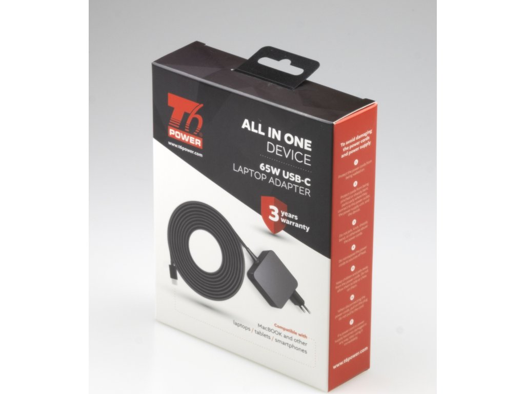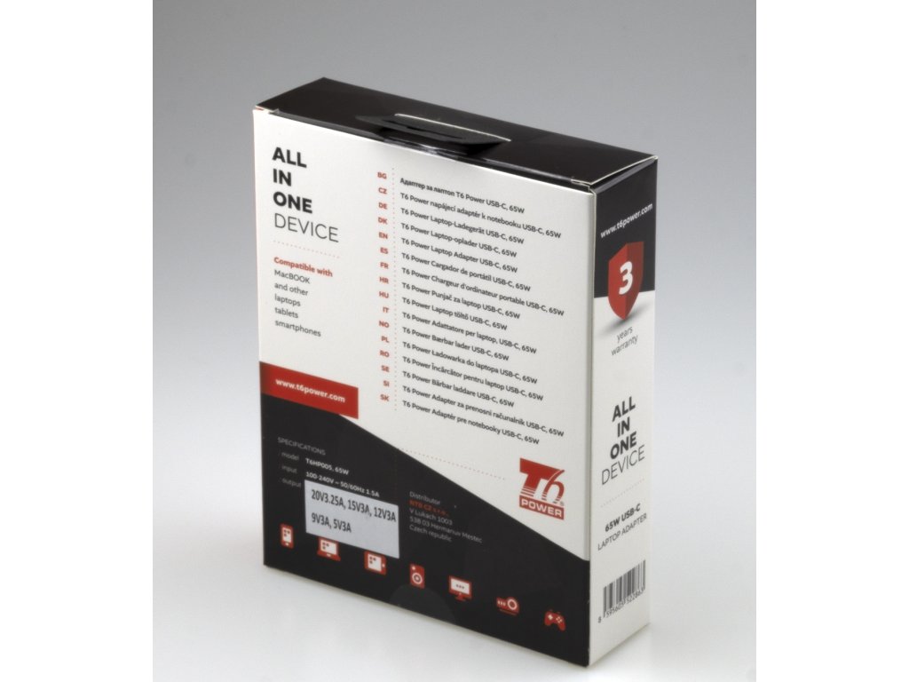 Univerzální adaptér značky T6 Power s výkonem 65 W je ideálním zdrojem energie pro notebooky, ultrabooky, MacBooky, tablety, mobílní telefony, monitory, atd.