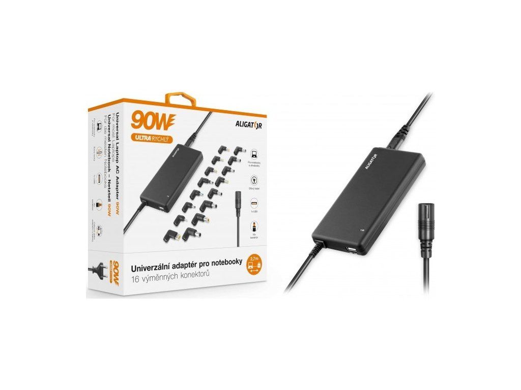 Ultra tenký síťový adaptér se 16 výměnnými konektory, USB a fantastickým výkonem 90W řady ALIGATOR POWER.