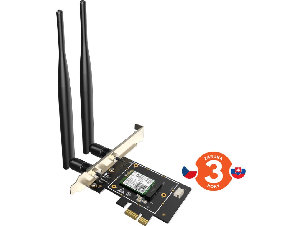 Bezdrátový Wi-Fi PCI Express adaptér s Wi-Fi 6E a Bluetooth 5.2. Rychlost AX5400 až 5378 Mb/s, 802.11ax/ac/a/b/g/n, 2x odnímatelná anténa 5 dBi, MU-MIMO, zabezpečení WPA3-SAE, 64/128bit WPA/WPA2-PSK, (2,4GHz 574Mb/s + 2x 5GHz 2402 Mb/s), 1024QAM, Windows 10 a 11, Bluetooth BLT 5.2/5.0/4.2/4.0, PCIe, autoinstalace.