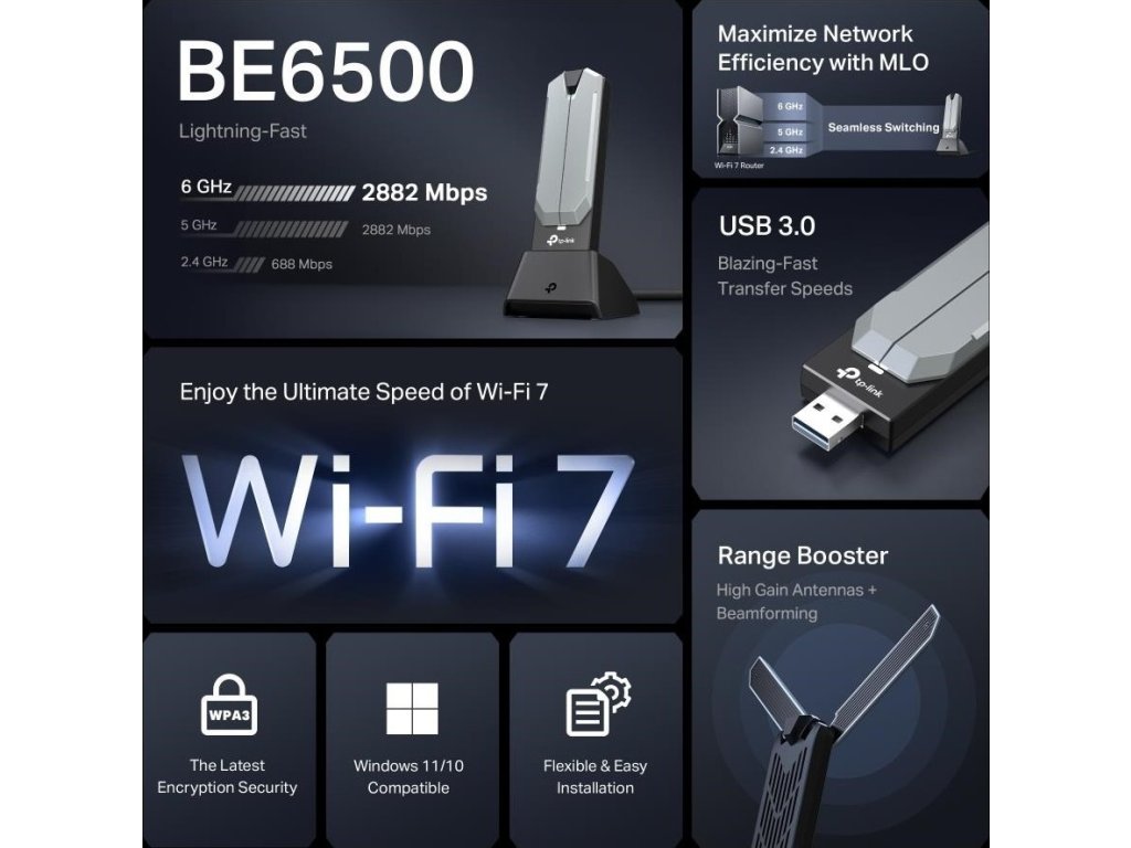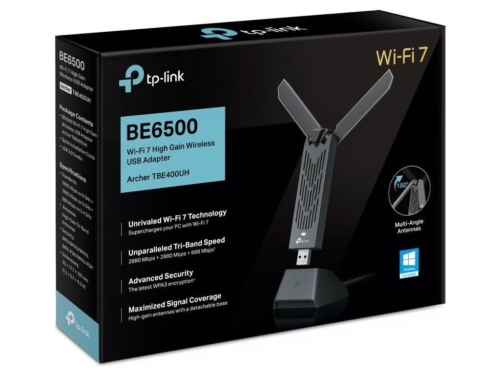 | Balenie obsahuje | • BE6500 Wi-Fi 7 High Gain Wireless USB Adapter Archer TBE400UH • Rýchly inštalačný sprievodca • USB 3.0 Držiak |