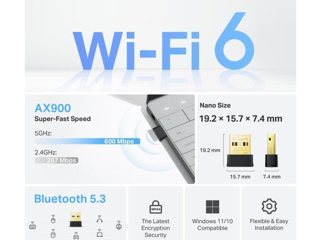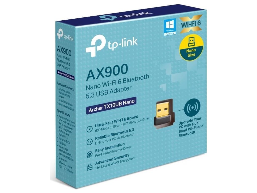 | Obsah balenia | AX900 Nano Wi-Fi 6 Bluetooth 5.3 USB adaptér Archer TX10UB Nano Rýchly sprievodca inštaláciou |