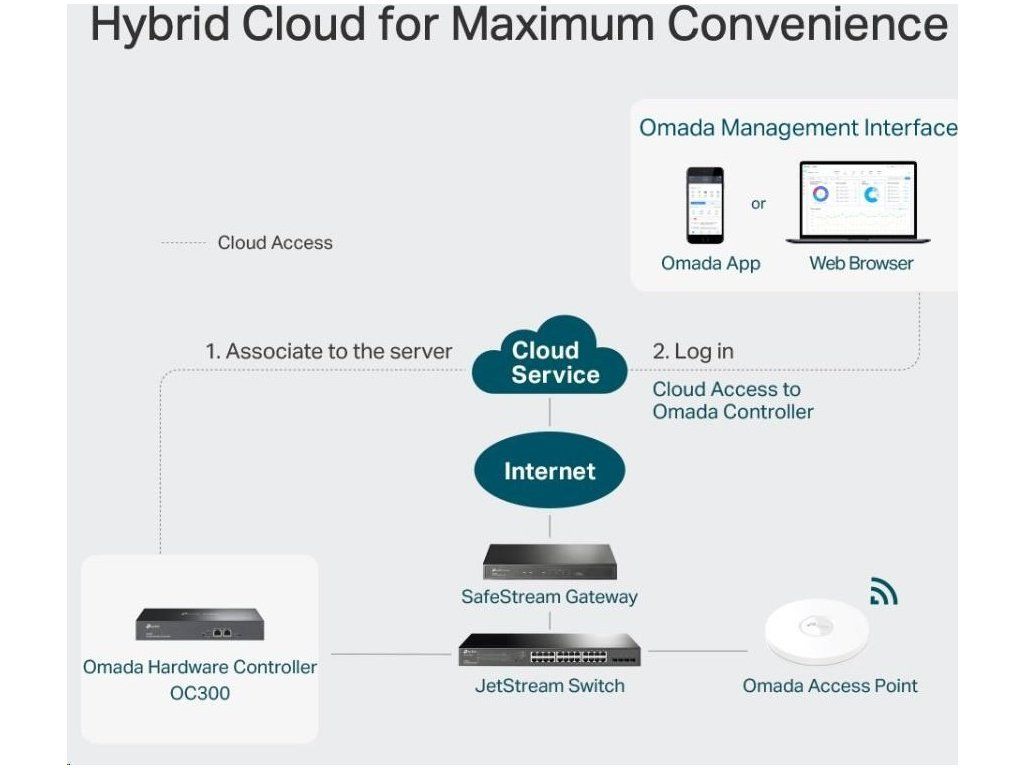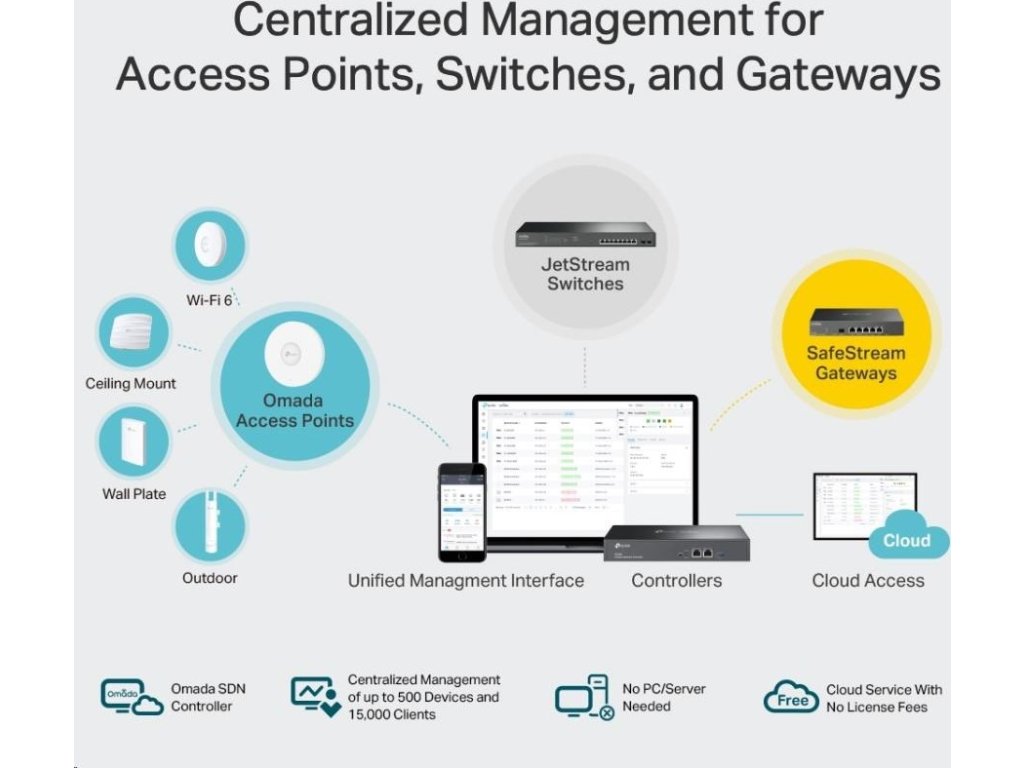 - Centralizovaná správa - až 500 prístupových bodov Omada, 100 JetStream switchov a 100 SafeStream smerovačov.