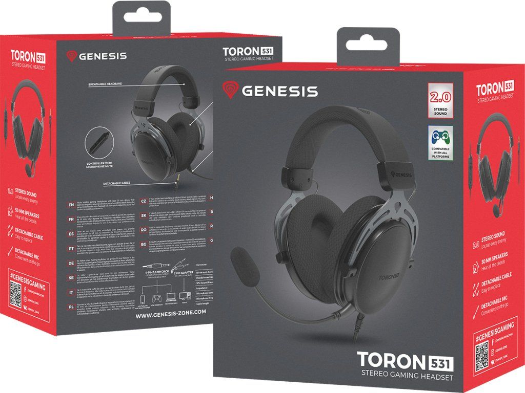 Genesis TORON 531 je multiplatformní náhlavní souprava. To znamená, že ji můžete snadno připojit k zařízením vybaveným 3,5mm konektorem. Navíc vám plně odnímatelný kabel a mikrofon usnadní přepravu a přídavný ovladač zase usnadní ovládání. V balení najdete také rozbočovač, který vám umožní připojit náhlavní soupravu k počítači vybavenému samostatným konektorem pro mikrofon a sluchátka.