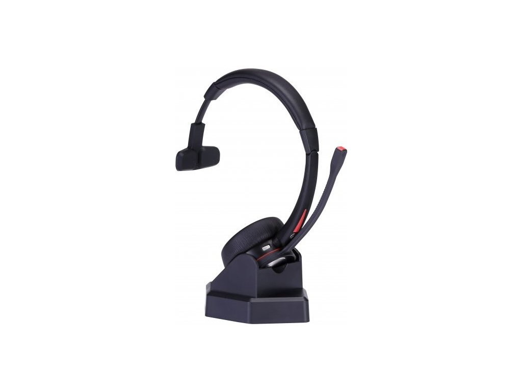 Bezdrátová jednoušní náhlavní souprava s moderním designem a praktickou dokovací stanicí.