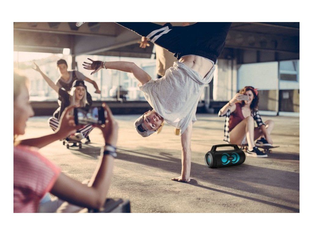 Mať pripravený vlastný výber party songov je top, ale keď musíš improvizovať, hodí sa aj možnosť naladiť FM rádio a svoju obľúbenú stanicu. Ktorúkoľvek akciu si môžeš skúsiť aj odmoderovať vďaka pribalenému mikrofónu, ktorý je parádnou výbavou aj pre karaoke. 3 režimy LED podsvietenia na prednom paneli ešte dotvoria atmošku. Svoj playlist potom spustíš cez Bluetooth 5.3, ktorý sa spáruje s rôznymi zariadeniami a je zárukou kvalitného prenosu až na 18 m. Alebo môžeš využiť USB, microSD kartu, prípadne kábel.