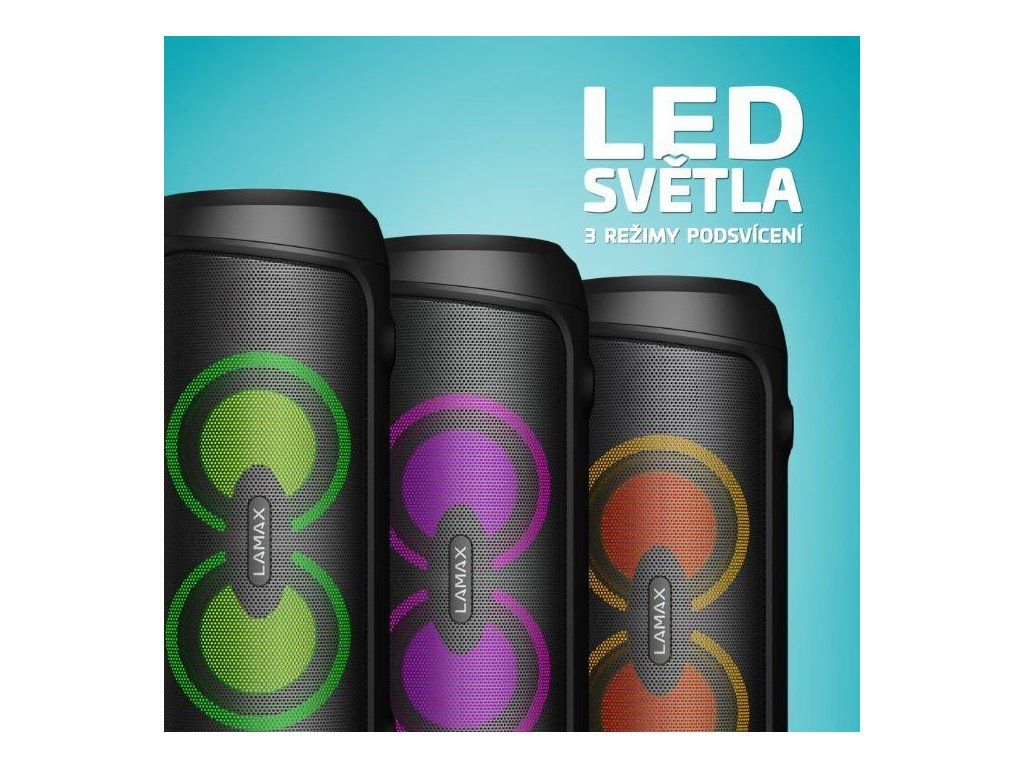 Celá predná strana reproduktora je osadená LED podsvietením s tromi režimami pre dotvorenie atmosféry každej akcie.