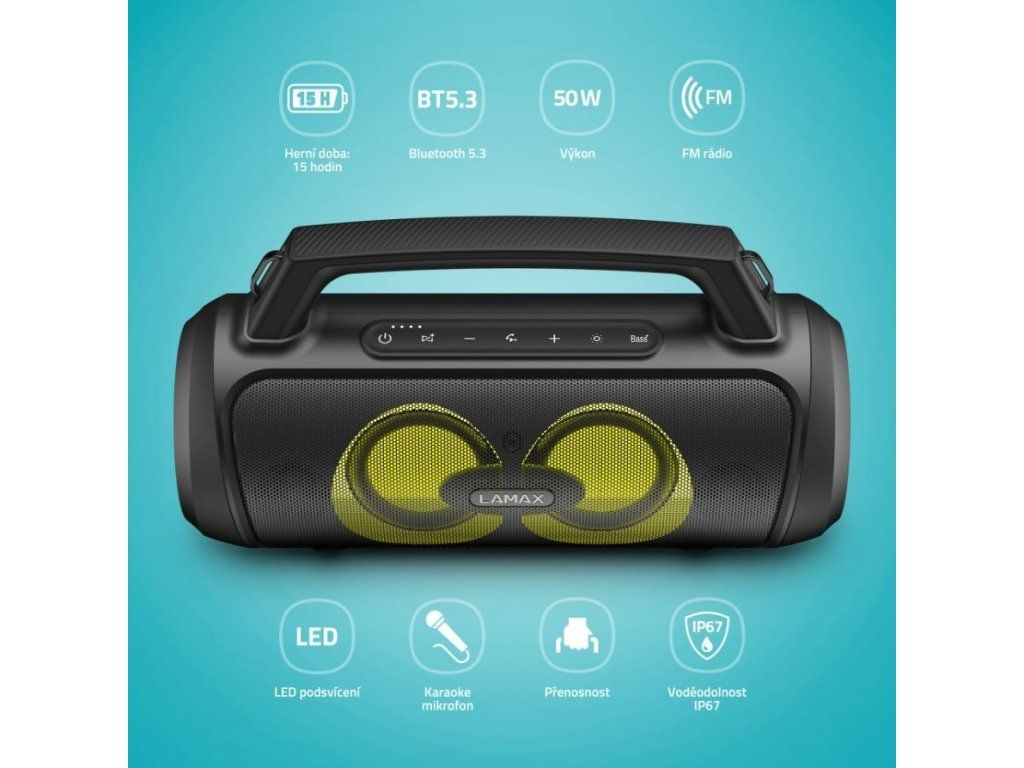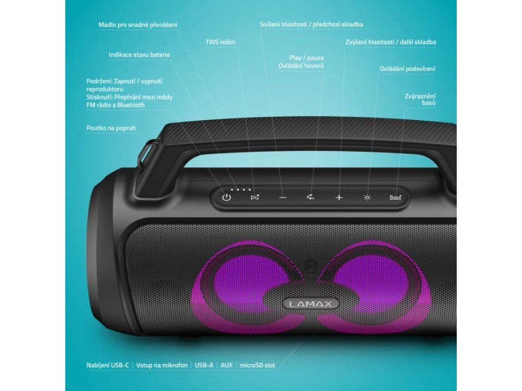 | Funkcia | Funkcia powerbanky cez USB-A port, ovládanie skladieb (Prehrať/Pozastaviť, Ďalšia/Predchádzajúca skladba), ovládanie hlasitosť, ovládanie telefónnych hovorov (Prijímanie / odmietanie prichádzajúcich hovorov, ukončenie hovoru), podpora hlasových asistentov (Siri, Google Assistant), TWS funkcie , LAMAX BeatBass® technológia, moderovanie + karaoke režim s mikrofónom, FM rádio |