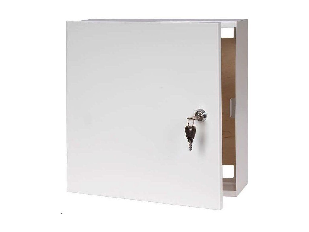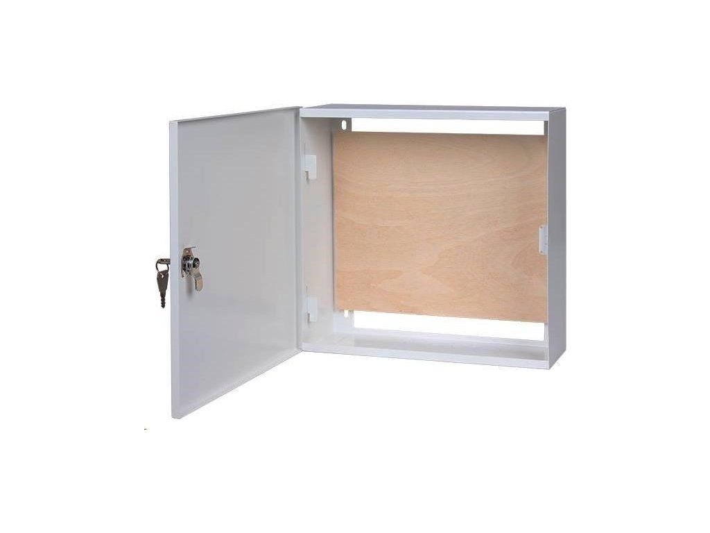 Lexi-Net Basic univerzálna skrinka 300 x 300 x 100 mm, biela Univerzálna uzamykateľná skrinka, povrchová montáž rozmer 300x300x100mm materiál oceľ 0,8mm s práškovou farbou - biela Montážna doska - preglejka 290 x 230 x 8mm Rozmer balenia 305x310x105 hmotnosť netto / s obalom 1,6kg / 1,72kg Krytie IP20.