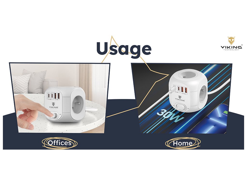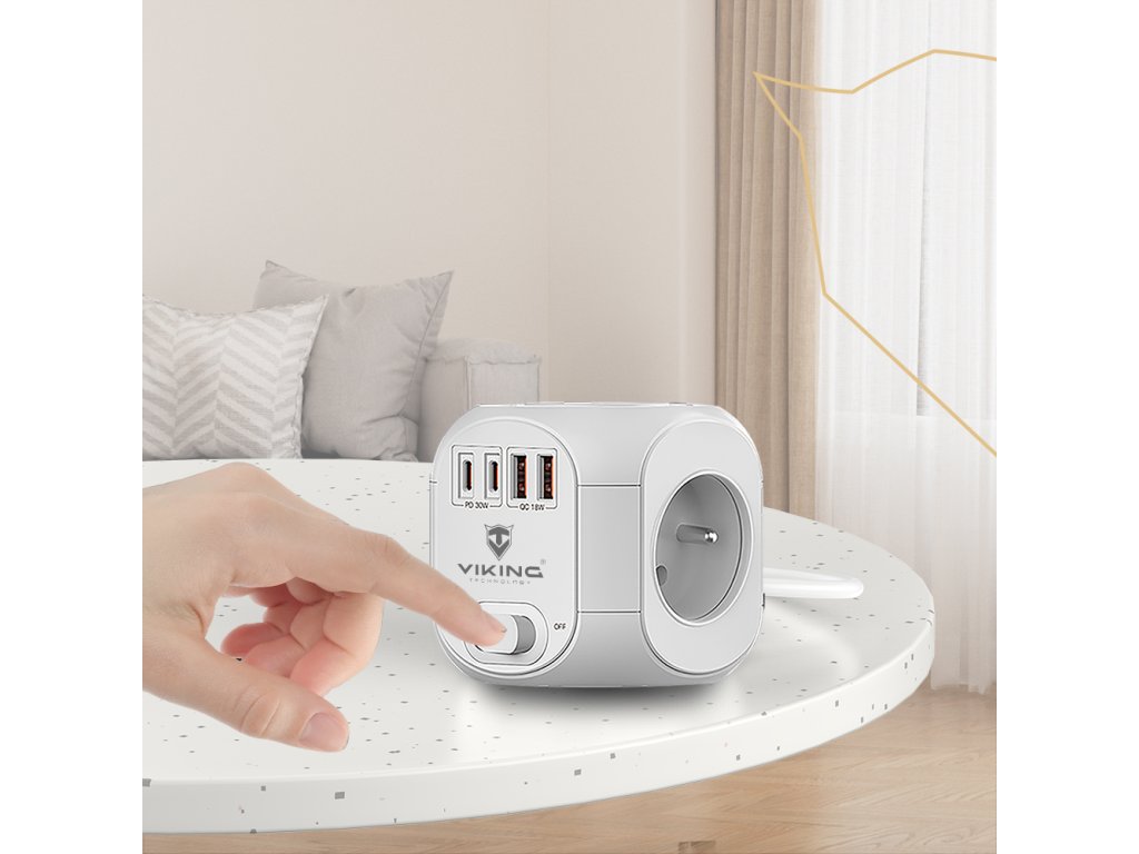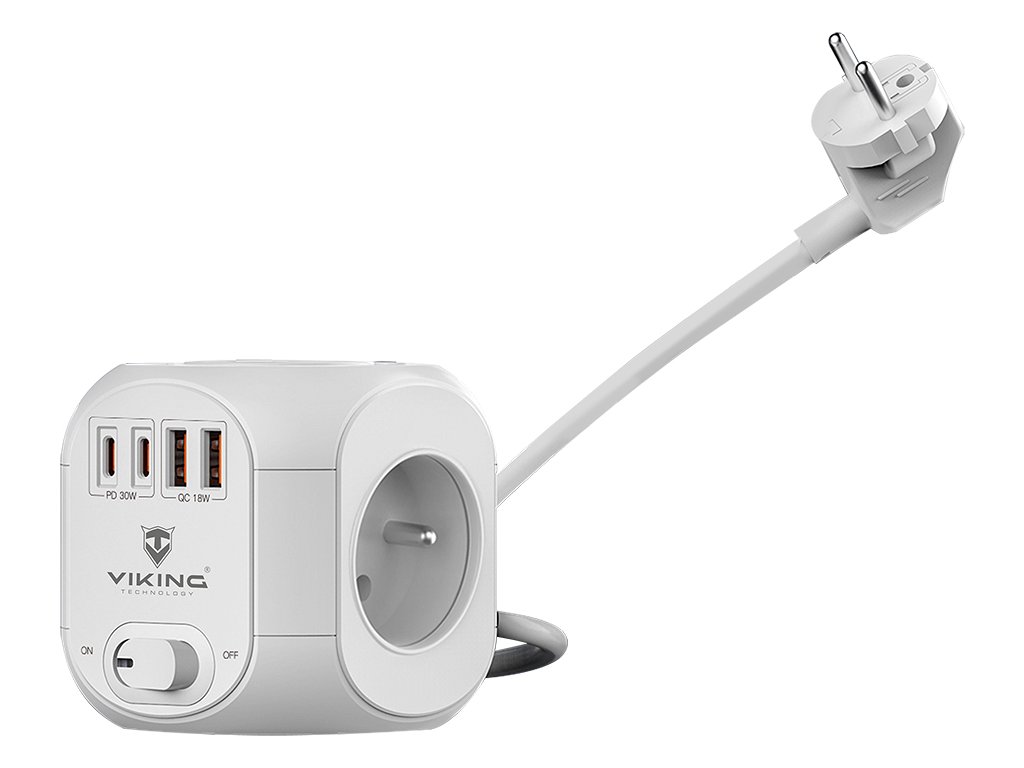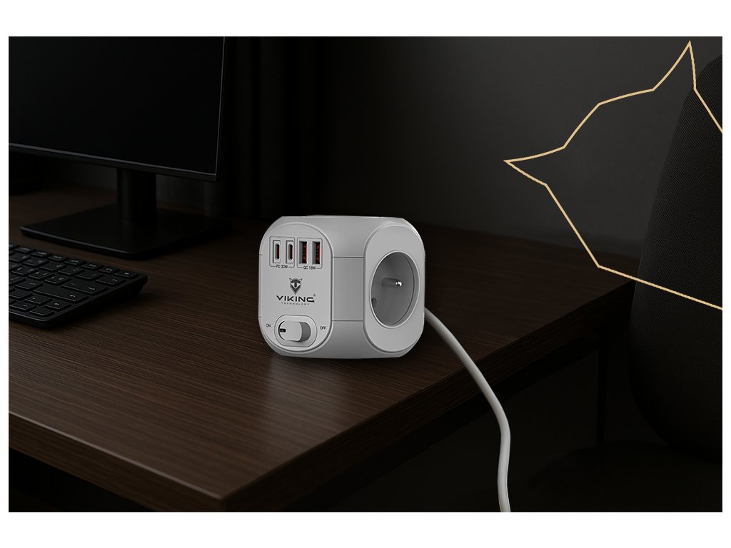 Viking AC CUBE PD30 kombinuje štyri USB porty (2× USB-C, 2× USB-A), štyri sieťové zásuvky a 1,8m predlžovací kábel v jednom elegantnom a priestorovo úspornom zariadení. Umožňuje súčasne napájať až osem spotrebičov alebo elektroniky, pričom zbytočne nezaberá miesto na pracovnom stole.