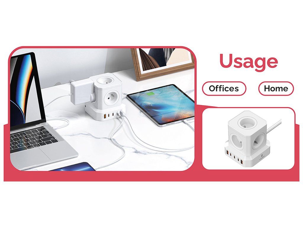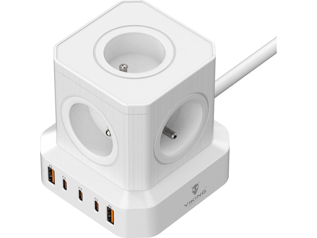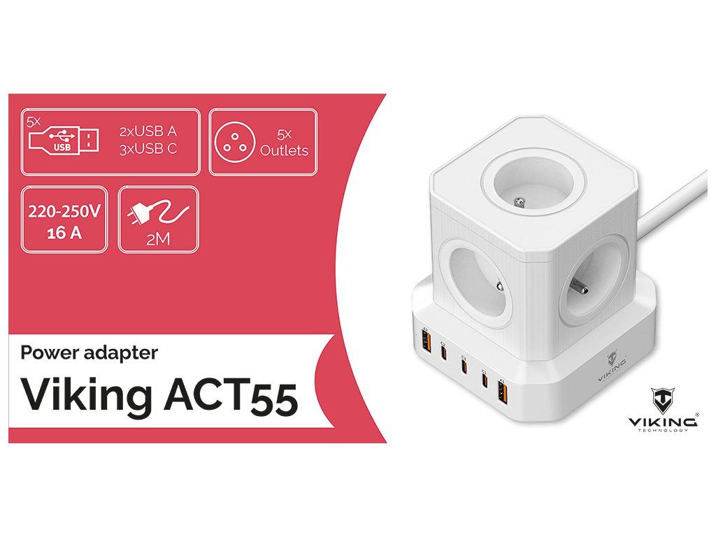Viking ACT55 kombinuje päť výkonných USB portov (3× USB-C a 2× USB-A), päť zásuviek na striedavý prúd a 2m predlžovací kábel v jednom kompaktnom zariadení, ktoré umožňuje súčasné napájanie až 10 zariadení.