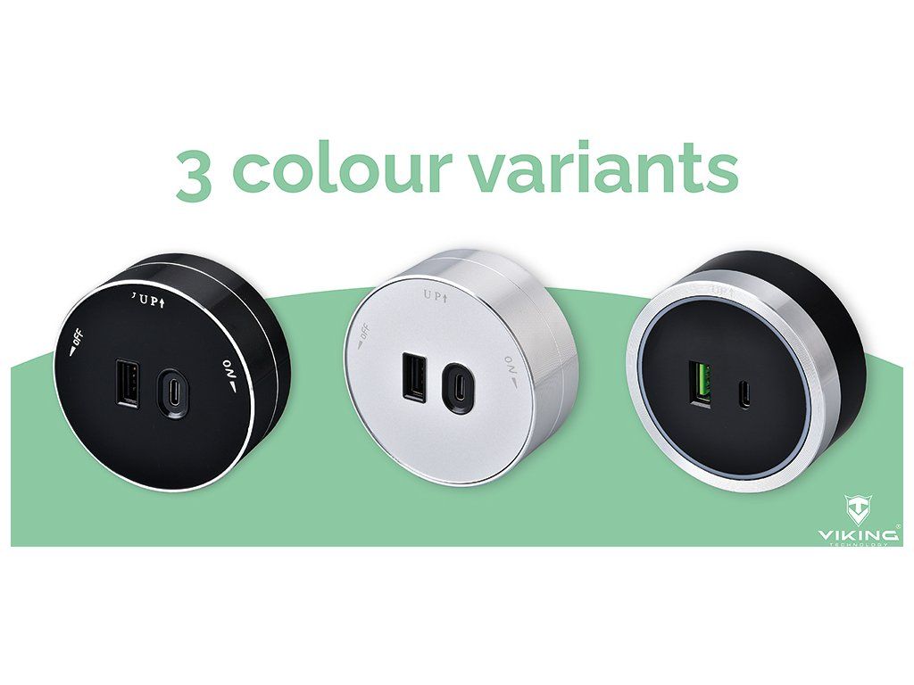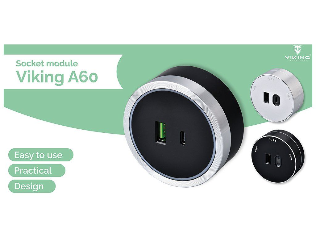 Zásuvkový modul Viking A60 je vybavený jedným USB-A výstupom (5V/2,4A) a jedným USB-C výstupom (5V/3,6A, PD) a je k dispozícii v troch farebných variantoch.