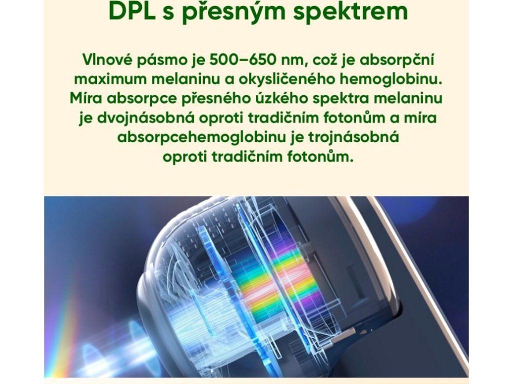 - Vyššia účinnosť než IPL: DPL technológia má 2x efektívnejšiu absorpciu melanínu a 3x efektívnejšiu absorpciu hemoglobínu než tradičné IPL.