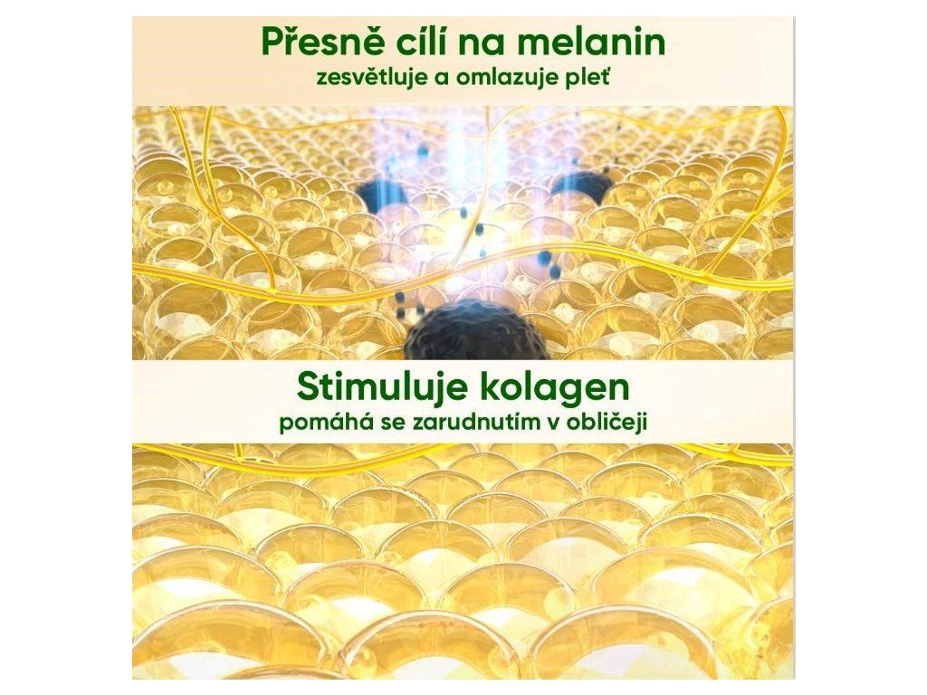 - Režim WHITEN (Bielenie škvŕn): Cielene sa zameriava na tmavé pigmentové škvrny, pihy a stopy po akné. Energia je pohltená nahromadeným melanínom, ktorý sa teplom rozloží na menšie častice a telo je následne prirodzene odbúrané. Škvŕny tak postupne blednú a sú menej viditeľné.