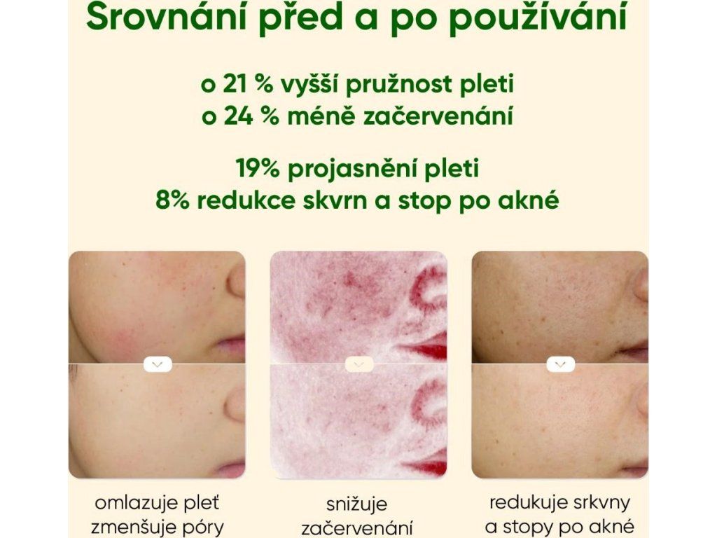 - Komplexné účinky: Redukuje pigmentáciu a začervenanie, lieči akné a jazvy, vyhladzuje vrásky, stiahnu póry a zvyšuje produkciu kolagénu a elastínu.