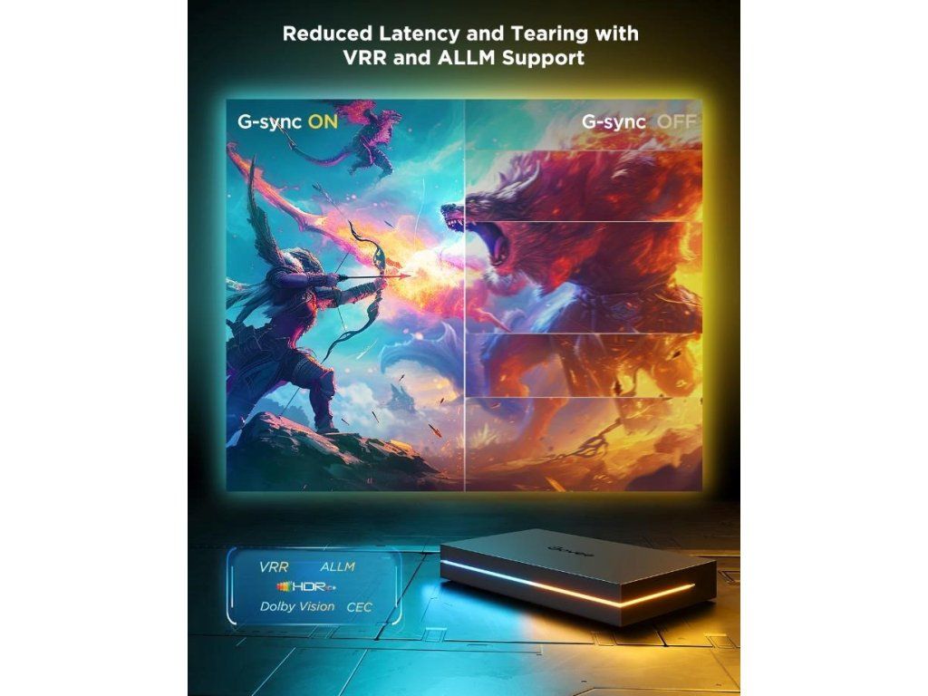 Govee AI Sync Box Kit 2 je vybavený HDMI 2.1, čo umožňuje podporu pokročilých funkcií, ako sú Dolby Vision, ARR a ALLM. Vďaka tejto technológii môžete očakávať špičkovú kvalitu obrazu s bohatými farbami a vyššou dynamikou, ideálnu pre moderné domáce kiná a herné sestavy. HDMI 2.1 zabezpečuje optimálnu kompatibilitu s najnovšími štandardmi, čo znamená plynulé prepínanie režimov a minimálne oneskorenie pre dokonale synchronizovaný vizuálny zážitok.