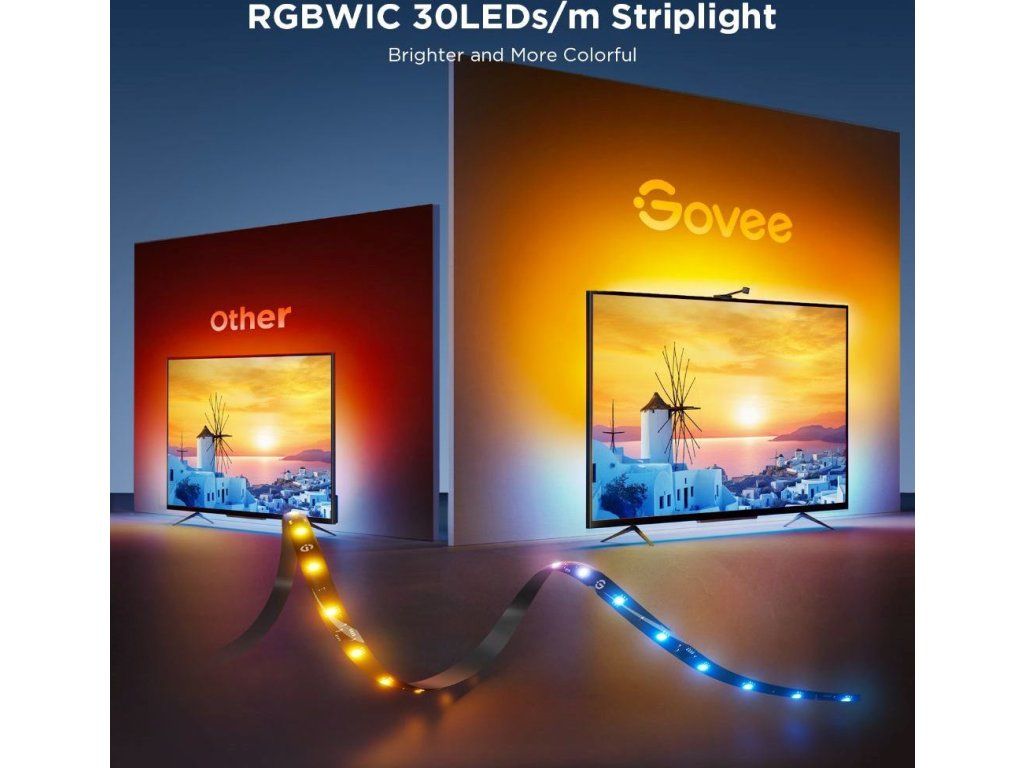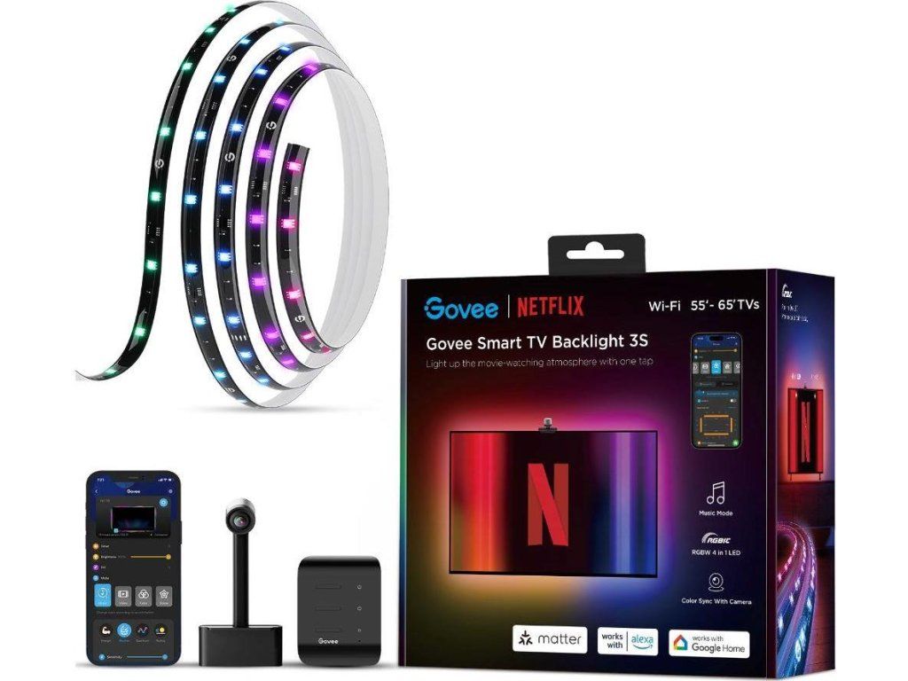 Vylepšite svoje filmové a seriálové zážitky s živým chytrým osvetlením Govee Smart TV Backlight 3S, ktoré vám Govee prináša spolu so spoločnosťou Netflix. 16 miliónov farieb s viac ako 99 režimami efektov, a ďalšie režimy pre synchronizáciu s hudbou, povznese zážitok zo sledovania televízie alebo hrania hier na novú úroveň vďaka smart technológii Envisual, ktorá sníma obrazovku a automaticky podľa toho upravuje nastavenia svetiel. Ovláda sa hlasom cez Siri, Amazon Alexa alebo Google Assistant. Vďaka podpore protokolu MATTER nie je problém integrácie do existujúcich smart home systémov. Nebudete preto ani musieť vstávať z gauča. Farebné podsvietenie opticky zväčšuje obraz a tiež šetrí vaše oči. Vďaka technológii RGBICW má pásik aj biele diódy pre kontrastnejšiu projekciu. Navyše je pásik vybavený riadiacimi obvodmi a ponúka oveľa rýchlejšiu reakciu na zmeny obrazu, podstatne vyšší jas a lepší kontrast ako obyčajné RGB pásky.