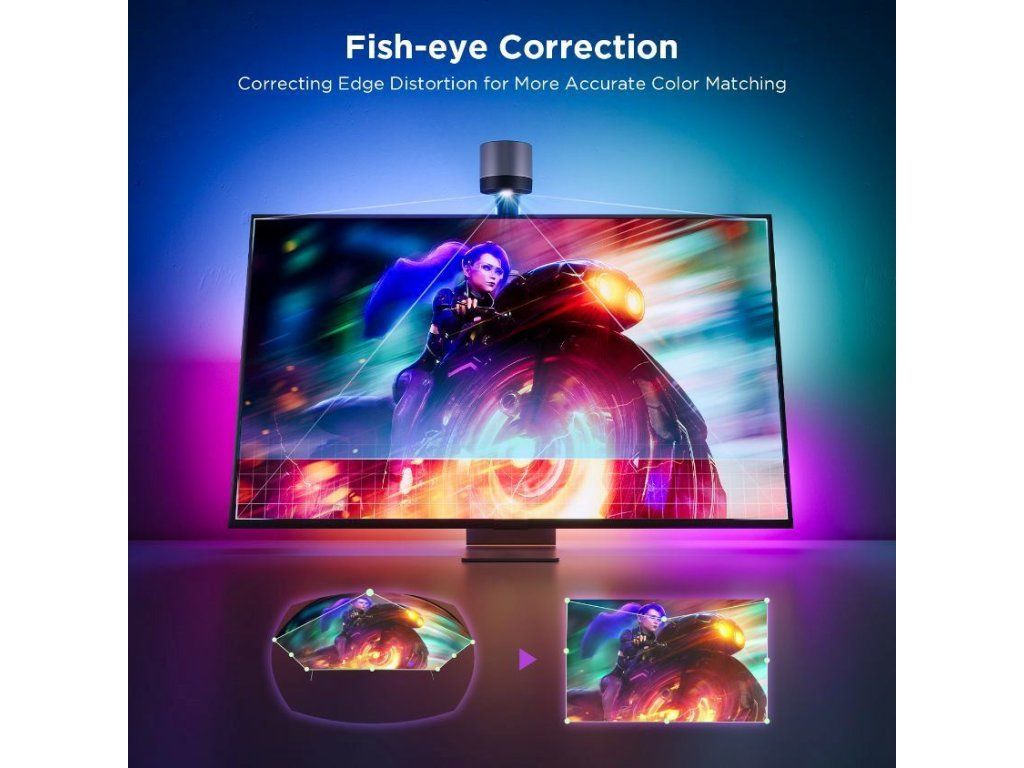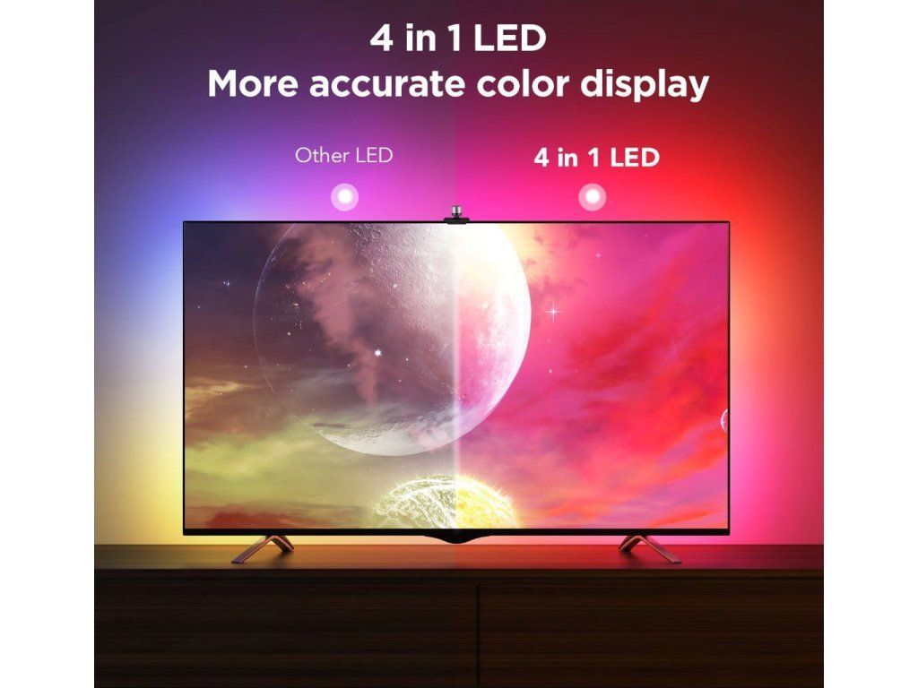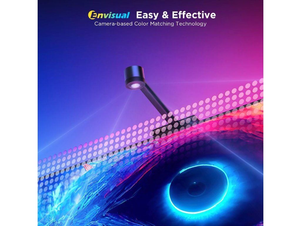 Špeciálna kamera s pokročilou technológiou Envisual inteligentne rozpoznáva a zachytáva farby na obrazovke vašej televízie alebo monitora. Na základe tejto farebnej analýzy automaticky vyhodnotí a nastaví ideálne podsvietenie. Užívajte si synchronizáciu farieb bez oneskorenia, aniž by ste potrebovali HDMI kábel alebo boli obmedzení streamovacími službami.
