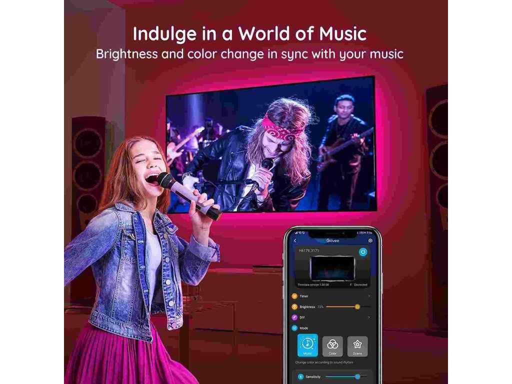 Jednoducho spravujte nastavenia farieb a intenzity svetla pomocou aplikácie Govee Home. Aplikácia je zadarmo na stiahnutie v Google Play a AppStore. Navyše získate prístup k funkcii časovača, farbám pre domácich majstrov, režimu videa, synchronizácii hudby a režimom scény.