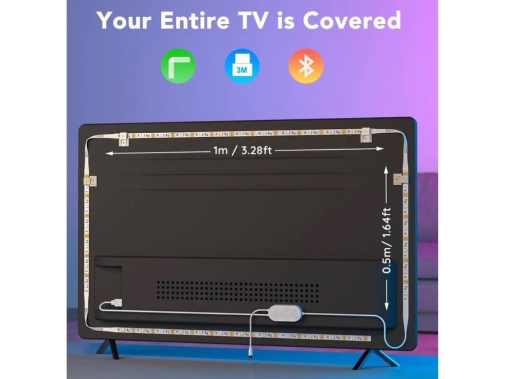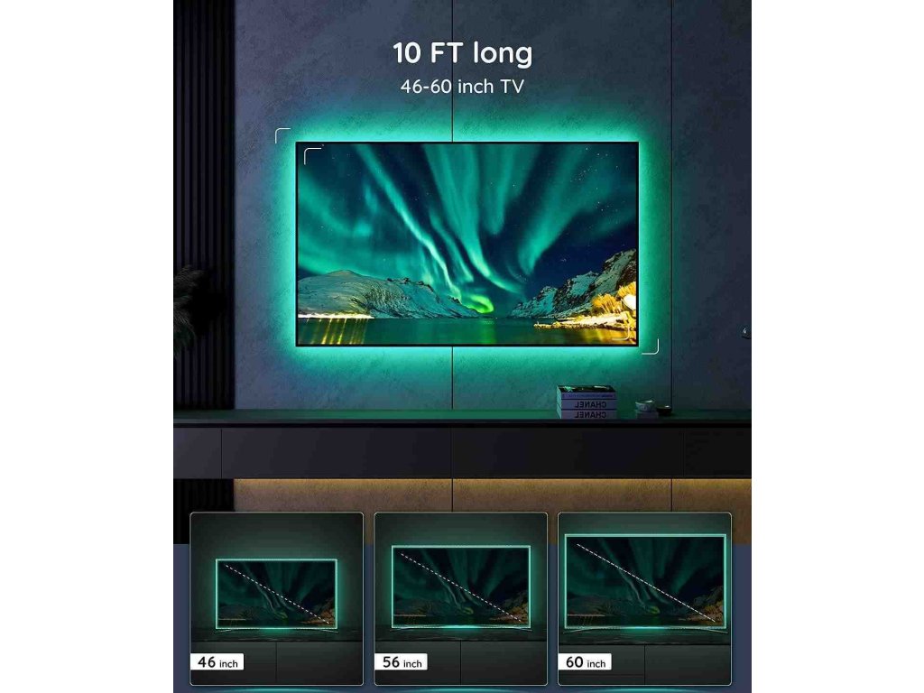 LED pásiky sú inštalované na zadnej strane televízorov alebo monitorov s veľkosťou 46-60 palcov - nie sú optimalizované pre zakrivené televízory. Balenie obsahuje 4 popruhy, ktoré sú spojené flex popruhmi. 2 bočné s dĺžkou 0,5 m a 2 dlhšie s dĺžkou 1 m, ktoré sa inštalujú pomocou 3M pások na zadnej strane televízora alebo monitora. Napájanie je dodávané cez USB nabíjačku (nie je súčasťou balenia).
