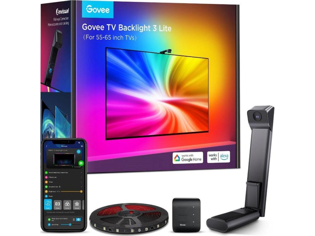 Govee prichádza so zcela novou koncepciou ambientného TV osvetlenia. Govee TV Backlight 3 Lite, kompletné riešenie pre scénické osvetlenie steny za televíziou, ktoré vás doslova vtiahne do deja. Vďaka LED diódám s technológiou 4 v 1 RGBICW a hustote 30 diod na 1 meter páska, dosahuje svetlo ohromujúcu intenzitu. Riešenie je s celkovou dĺžkou páska 3,6 m určené predovšetkým pre televízory s uhlopriečkou 55–65 palcov, teda pre najobľúbenejšie veľkosti.Životnosť diód je až 50 000 hodín, takže sa nemusíte obávať, Backlight 3 Lite je navyše vybavený detekciou zhasnutého displeja a automaticky svetlá vypína pri ukončení sledovania, čo je pohodlné, ale hlavne energeticky úsporné. Zásadnou vylepšením je však projekcia pomocou replikácie obrazu na TV obrazovke pomocou kamery. Tá sa veľmi jednoducho upevňuje nad TV a na stenu premieta presne farby v presnom rozložení, aby bol zážitok čo najlepší. Vďaka technológii Govee DreamView Sync môžete navyše TV svetlo synchronizovať s ďalšími až 7 Govee zariadeniami. Backlight 3 je kompatibilný s Google Home a Amazon Alexa asistenčnými službami, nainštalujete ho za pár minút pomocou 3M samolepiacich páskov. Backlight 3 Lite vám opticky zväčší uhlopriečku vašej televízie, doprajte si skutočné domácu kino.
