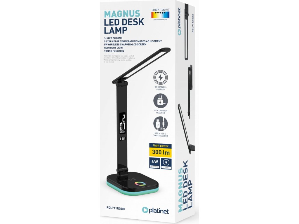 Lampa je vybavena multifunkčním displejem, který zobrazuje čas, datum i teplotu v místnosti. Nechybí ani vestavěný budík. Velkou výhodou je také integrovaná 5W bezdrátová nabíječka, díky které budete mít svůj chytrý telefon neustále nabitý a na dosah ruky – bez zbytečných kabelů. Praktická je i funkce automatického vypnutí pomocí 45minutového časovače.