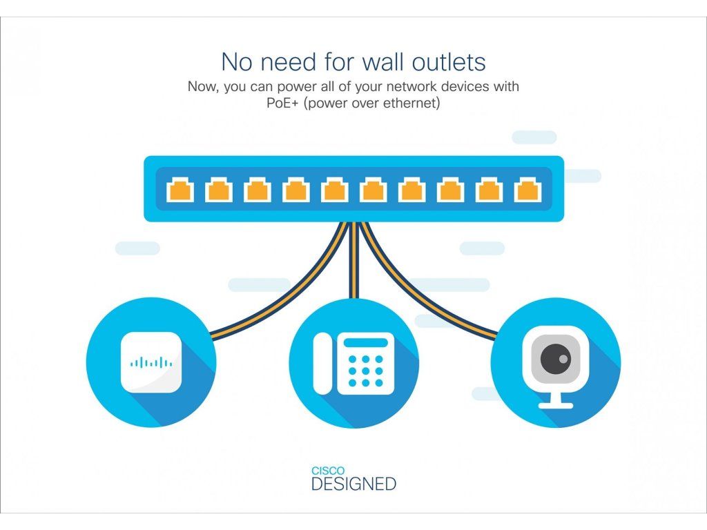 Přepínače Cisco Catalyst řady 1300 jsou k dispozici s až 48 porty napájení přes Ethernet (PoE). Tato funkce zjednodušuje nasazení pokročilých technologií, jako je IP telefonie, bezdrátové připojení a IP dohled, protože umožňuje připojit a napájet koncové body sítě přes jediný ethernetový kabel. Díky tomu, že není nutné instalovat samostatné zdroje napájení pro IP telefony nebo bezdrátové přístupové body, můžete využívat pokročilé komunikační technologie rychleji a s nižšími náklady. Modely podporují standardy 802.3af PoE a 802.3at PoE+.