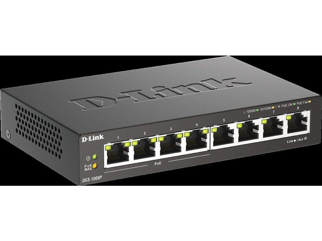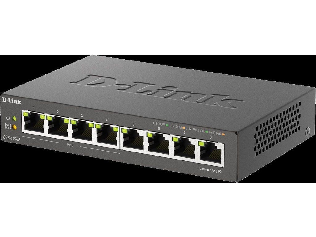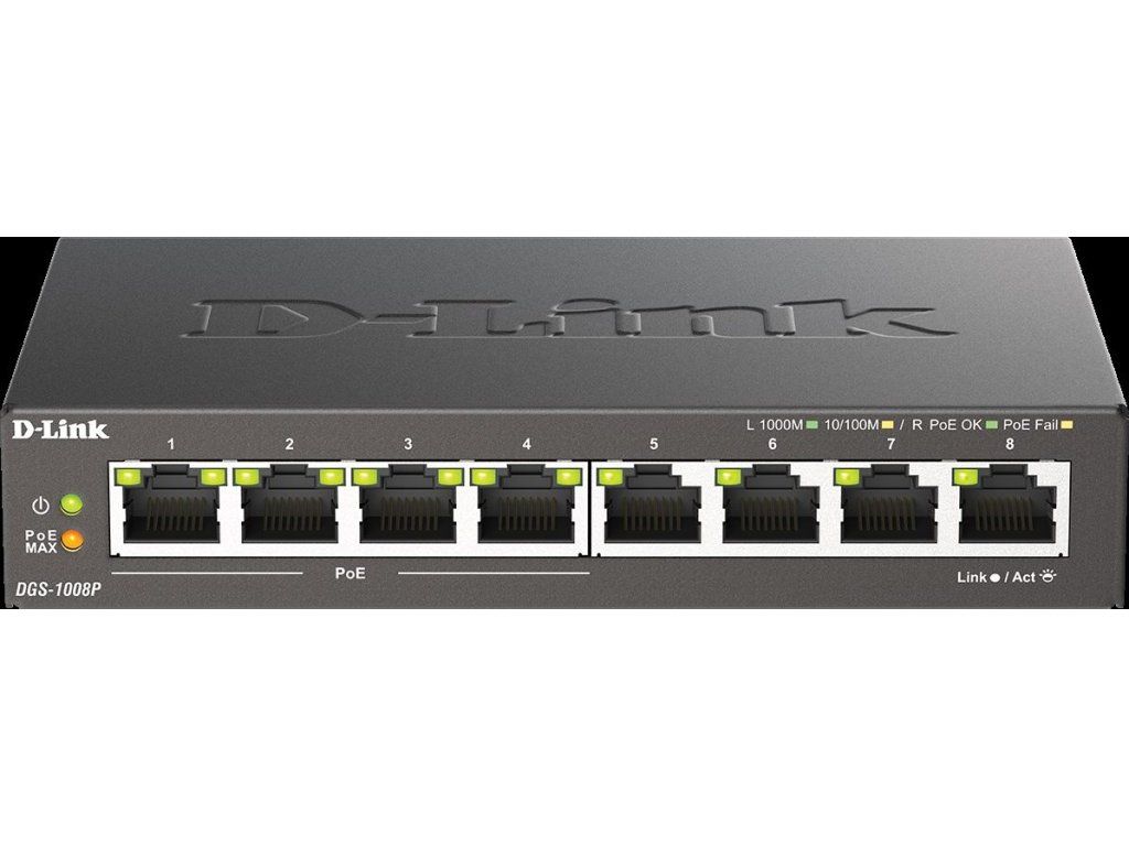 D-Link DGS-1008P 8-portový gigabitový stolový prepínač, 4 porty PoE+, rozpočet PoE 68 W