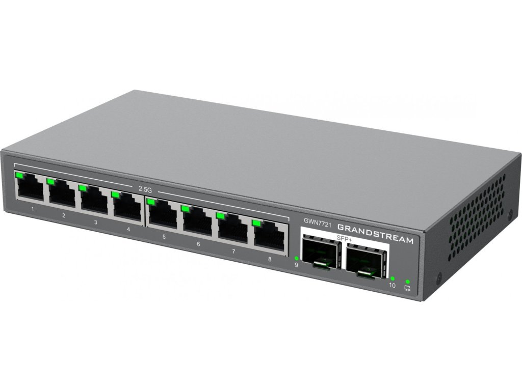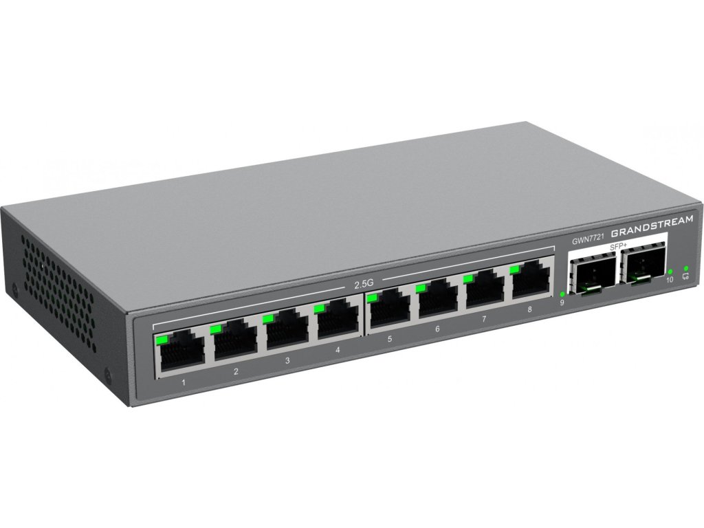 GWN7721 je 10portový managovatelný switch L2 Lite, vybavený 8x 2,5G ethernetovými porty a 2x 10gigabitovými SFP+ porty, vhodný pro malé a střední podniky pro budování škálovatelných, bezpečných a inteligentních sítí.