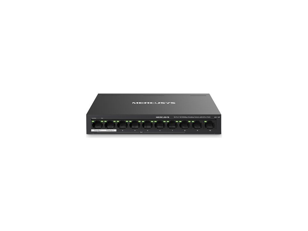 MS110P 10-Port 10/100Mbps Desktop Switch with 8-Port PoE+PORT: 8× 10/100 Mbps PoE+ Ports, 2× 10/100 Mbps Non-PoE PortsSPEC: Compatible with 802.3af/at PDs, 65 W PoE Power, Desktop Steel Case, Wall MountingFEATURE: Extend Mode for 250m PoE Transmitting, Priority Port1-2, Isolation Mode, PoE Auto Recovery, Plug and Play