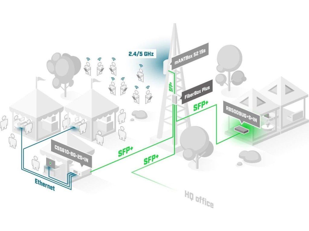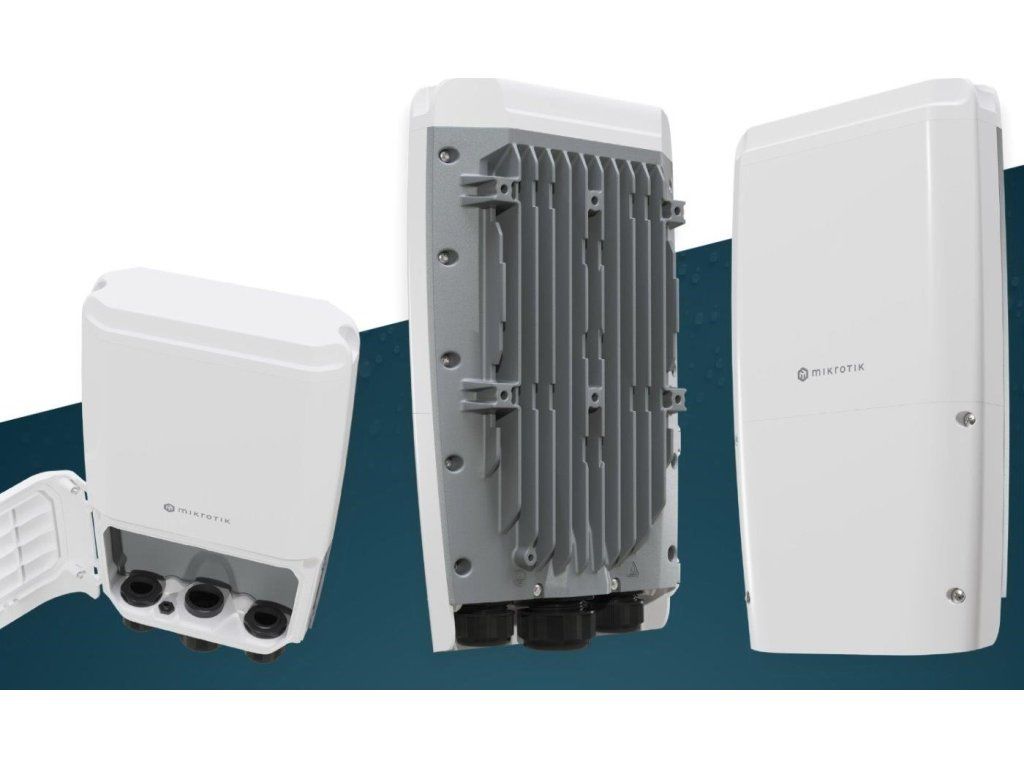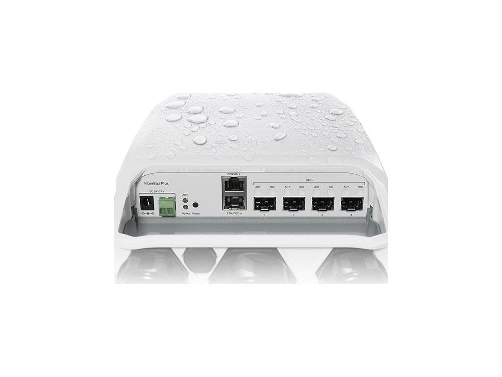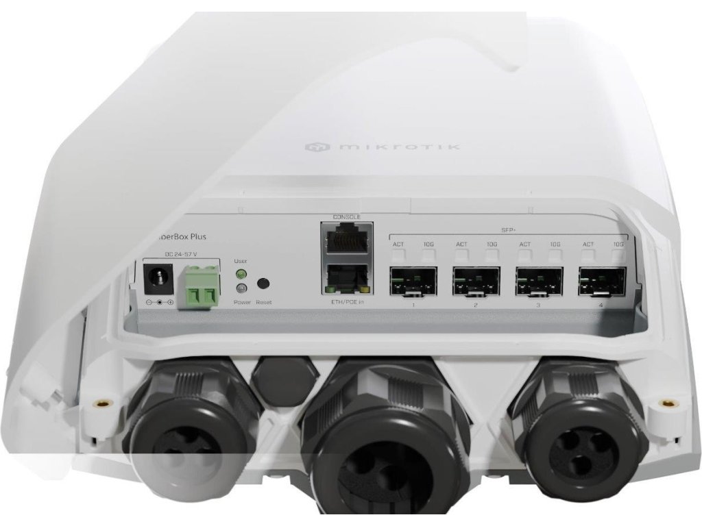 Venkovní 4-portový SFP+ switch bez ventilátoru a žebrováním na zadní straně s možností routingu nabízí Gigabitový ethernet pro management či PoE IN napájení, 4 optické SFP+ porty s rychlostí 1/10 Gbps, konzolový RJ45 port, DC konektor a svorkovnici s napájením 24 až 57 V DC. Switch má velmi robustní šasi s krytím proti vodě IP66, možností instalace na zeď či stožár a ve spodní části jsou připraveny dvířka na 4 šrouby s křížovou hlavou a 3 velké kabelové průchodky s dostačným prostorem na všechny kabely. Uvnitř zařízení je nainstalovaný jak RouterOS v7 s licencí L5 a SwitchOS, který je určený spíše pro jednodušší správu.