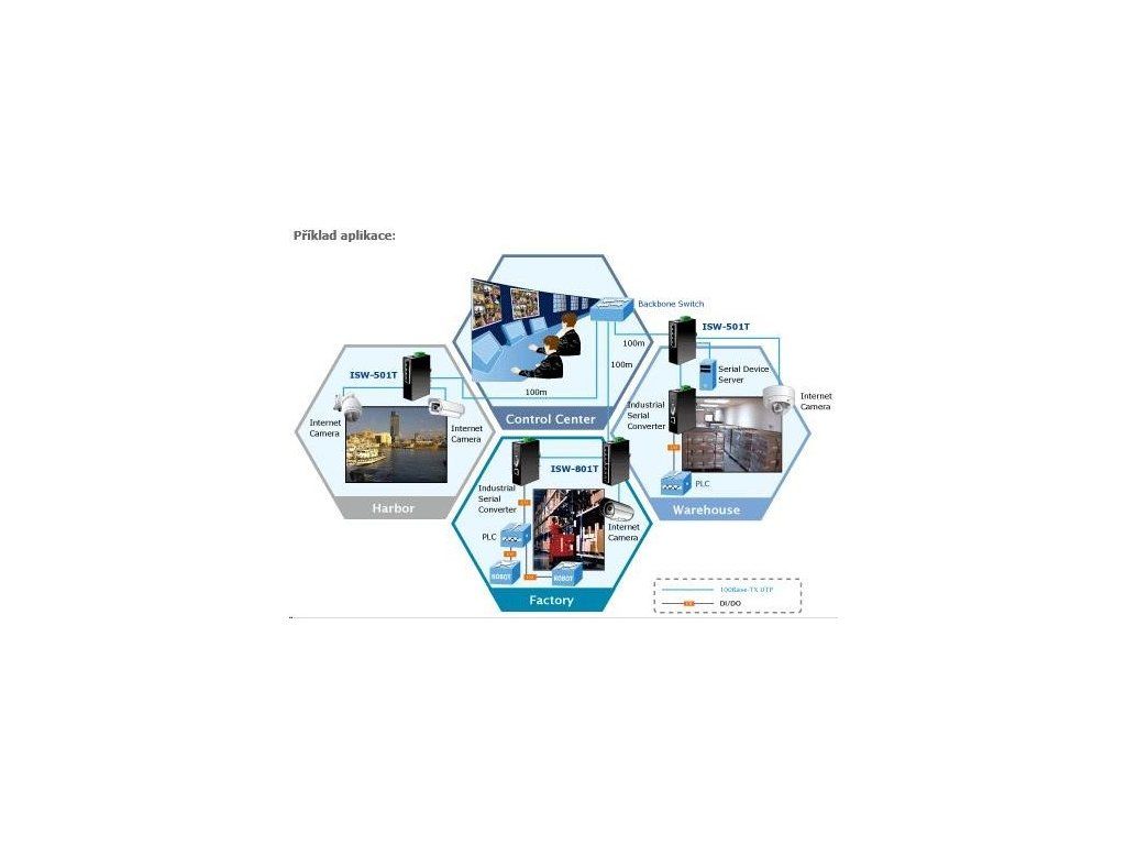 Planet ISW-501T, 5x 10/100, DIN, IP30, rozšírený teplotný rozsah -40 ~ 75 st.C Priemyselné ethernetové prepínače sú určené do náročných prevádzkových podmienok so širokým rozsahom prevádzkových teplôt, neistým napájaním a častými otrasmi. Prepínače radu ISW sa ľahko inštalujú na štandardnú lištu DIN alebo priamo na stenu a umožňujú nasadenie známej technológie Ethernet aj v priemyselnom prostredí. Sú vhodné aj na inštaláciu vo vonkajších krytoch s veľkými výkyvmi prevádzkových teplôt (typicky bezdrôtové aplikácie a aplikácie MAN ISP). Vlastnosti: 5 portů 100 Base-TX, Switching, Full Duplex (100/200 Mbps), Auto-Negotiation (10/100 Mbps) 2k MAC adres automatická detekce přímý/křížený kabel na každém portu pole LED indikátorů pro diagnostiku provozu instalace na DIN lištu, montážní díl součástí instalace na zeď, montážní díl součástí krytí IP30, skříň celohliníková napájení: 12-48V DC redundantní, připojení možné ze dvou různých zdrojů (nejsou součástí balení) ochrana proti přepólování, připojení napájení na svorkovnici, umístění na spodním panelu (nepřekáží při montáži na zeď) zařízení je odolné proti pádu (IEC-60068-2-32) z výšky 75cm na všechny dopadové části zařízení je odolné proti vibracím (IEC-60068-2-6) 10-500-10Hz, 4x g, 0,5oct/min zařízení je odolné proti přetížení krátkodobému zrychlení 50x g, dlouhodobému 4x g (IEC-60068-2-27) EMI/EMS, elektromagnetická kompatibilita a slučitelnost dle CE EN-6100-4-2,3,4,5,6 elektrická bezpečnost d C, vlhkosť do 90 % výkon 11 W hmotnosť: 438 g rozmery: 135 x 87 x 32 mm.