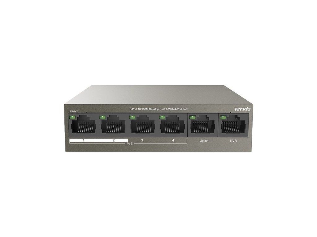 Tenda TEF1006P-4-63W prepína dáta pomocou 6 portov RJ45 s rýchlosťou 10/100 Mb/s s automatickou detekciou rýchlosti. Dva porty slúžia ako Uplink a 4 porty PoE podporujú PoE 802.3af a 802.3at. Prepínač podporuje stabilné 8-jadrové napájanie PoE, 6kV prepäťovú ochranu. Podpora prepínania uzlov typu Store-and-Forward. Plne duplexné riadenie toku 802.3x, poloduplexné riadenie toku v režime Back-Pressure. Dva porty Uplink možno použiť na pripojenie prepínača k sieti a druhý na pripojenie iného zariadenia bez PoE, napr. NVR a ďalšie.