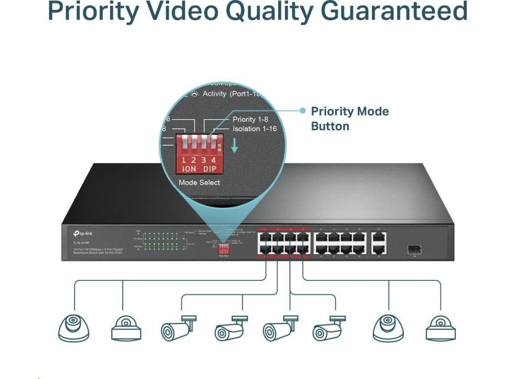 - Prioritný režim pre porty 1-8, ktorý zaručuje kvalitu citlivých aplikácií, ako je napríklad video monitorovanie.