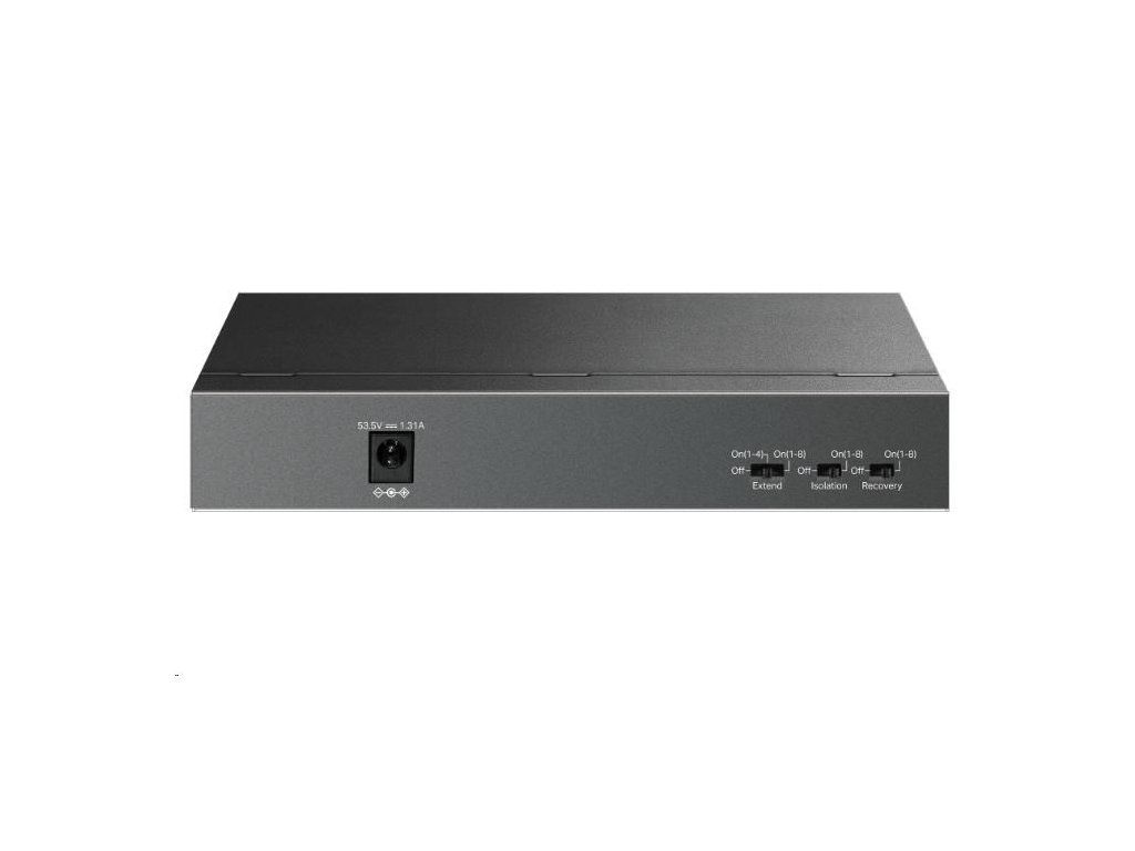 | Pokročilé vlastnosti | • Tlačidlo Mode Extend (porty 1–4/1–8, až 250 m napájanie PoE a prenos dát) • Tlačidlo režimu izolácie (porty 1–8) • Tlačidlo Auto Recovery PoE (porty 1–8) • Kompatibilný s PD IEEE 802.3af/at • Automatické učenie MAC adries a ich automatické vymazanie • IEEE 802.3x riadenie prietoku • Zelená technológia |