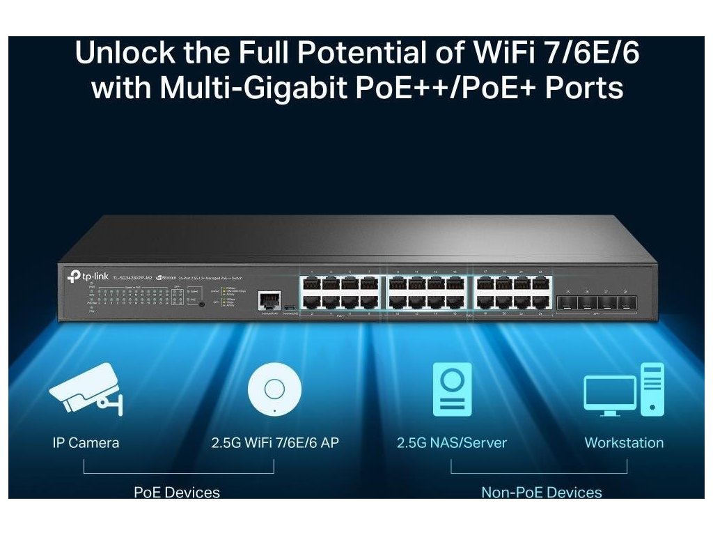- 2,5G PoE++/PoE+ porty pre WiFi 7/6E/6: 24× 2,5 Gbps porty prekonávajú bariéru 2,5G a odomykať plný potenciál WiFi 7/6E/6 AP.