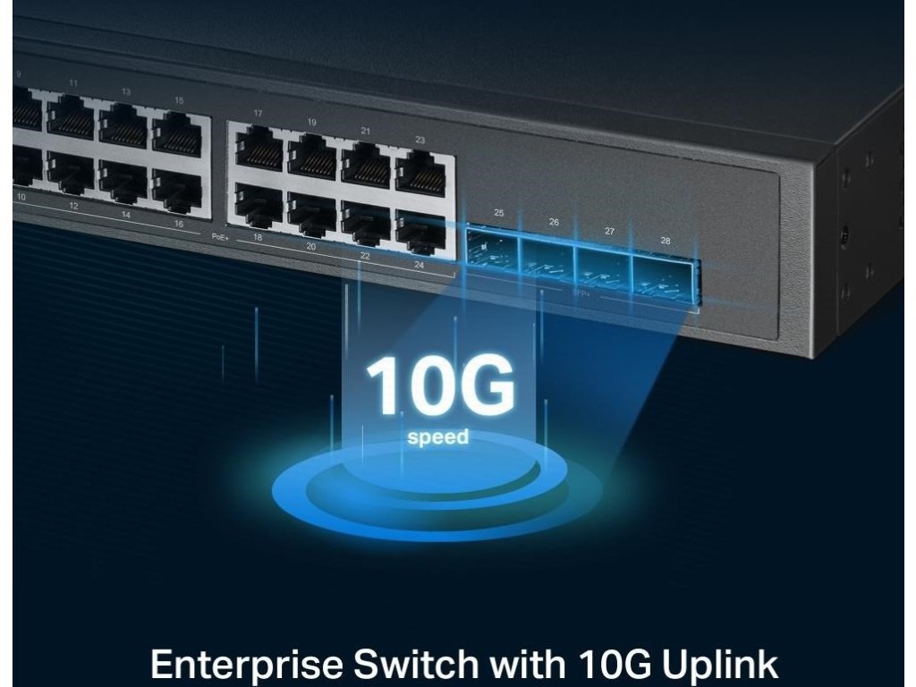- 10G Lightning-Fast Uplink: 4× 10 Gbps SFP+ zásuvky umožňujú širokopásmové pripojenie a neblokujúcu kapacitu prepínača.