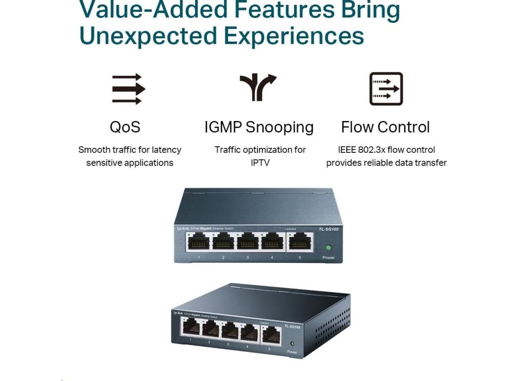 Stolný switch TL-SG105 predstavuje jednoduchý spôsob, ako zvýšiť rýchlosť vášho sieťového servera a hlavných pripojení. Či už pracujete z domu alebo z kancelárie, switch TL-SG105 vám pomôže rýchlo a jednoducho splniť pracovné úlohy.