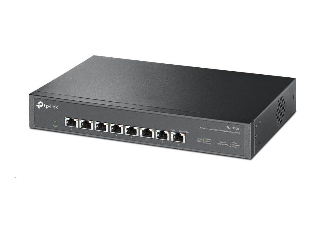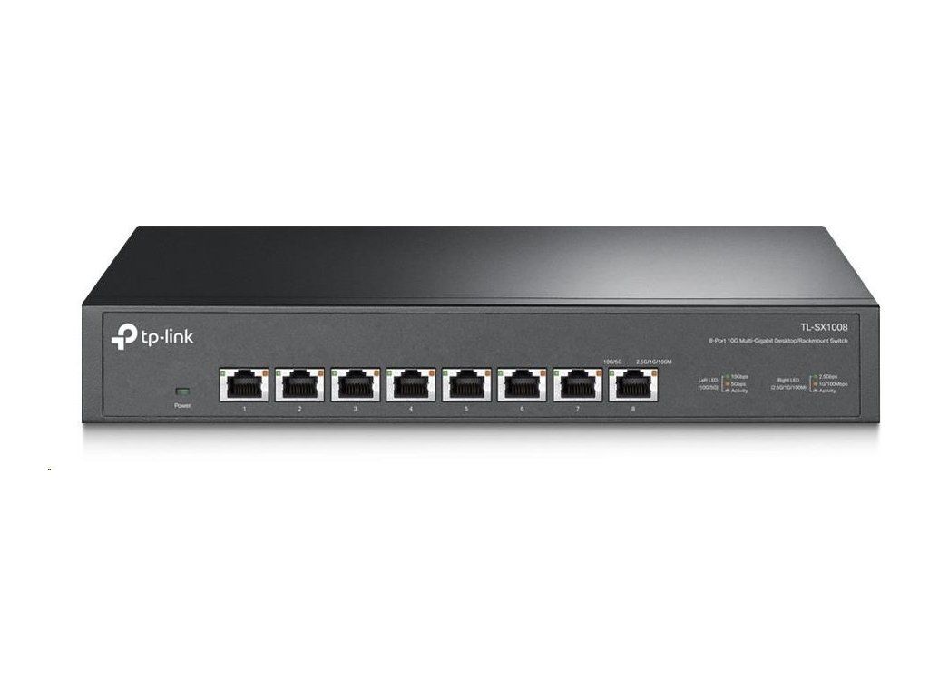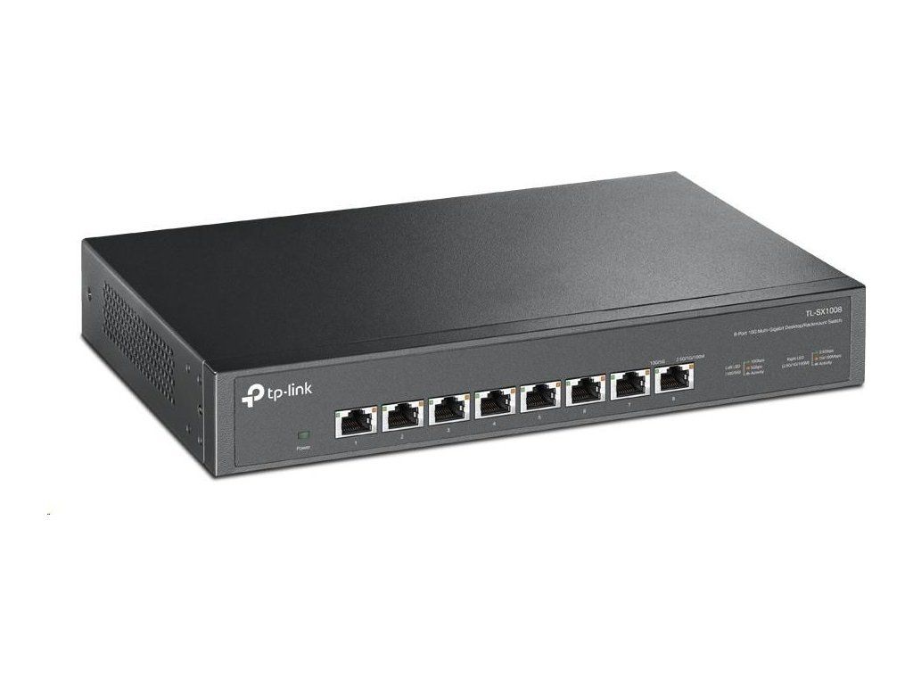 Switch TL-SX1008, ktorý je vlajkovým produktom segmentu 10G, je 8portový stolný/rackový switch 10G s kapacitou prepínania až 160 Gbit/s. Funkcia automatického vyjednávania rýchlosti 5rýchlostného pripojenia (100 Mbit/s / 1G / 2.5G / 5G / 10G) monitoruje rýchlosť pripojenia a inteligentne ju prispôsobuje pre kompatibilitu a optimálny výkon všetkých vašich zariadení, vrátane úložísk NAS 10G, serverov 10G, pracovných staníc, herných počítačov, prístupových bodov 2.5G/5G/10G Wi-Fi 6, 8K videí, stolných počítačov a ďalších aplikácií.