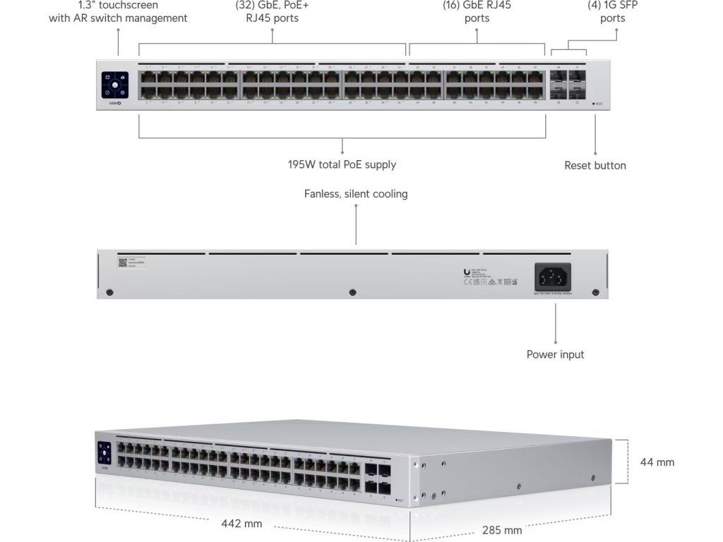 USW-48-POE je managovatelný Gigabitový L2 switch s 48x Gigabit LAN porty, z čehož 32 portů podporuje 802.3af/at PoE-Out, celkovým PoE Budgetem 195W a čtveřicí portů SFP s maximální přenosovou rychlostí 1Gbps. Switch má kromě standardní výbavy také 1,3" dotykovým displej pro poskytování informací o systému, teplotě, statistice portů, PoE napájení a mnoho dalšího. Switch má na svůj výkon, počet portů s funkcí PoE skvělou hloubku - pouhých 28cm.